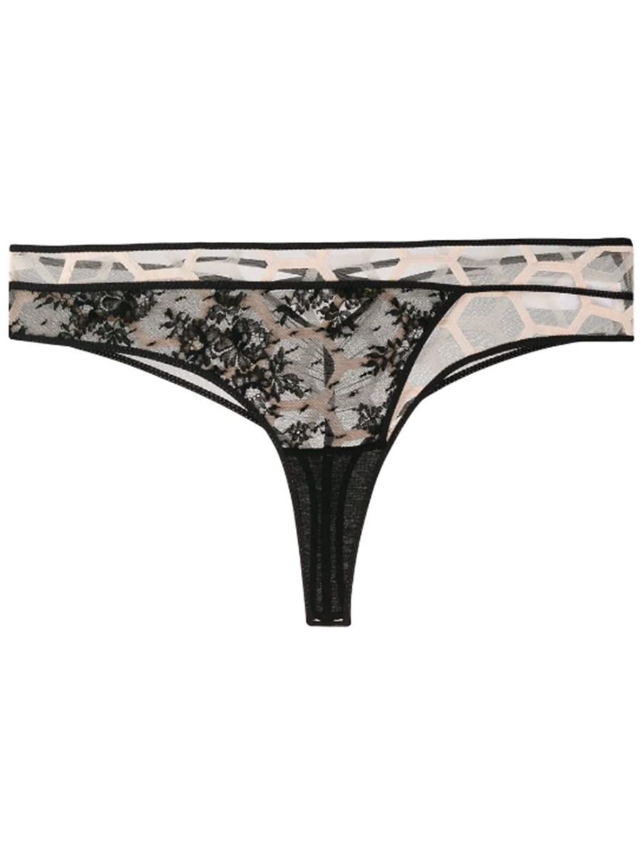 Black and nude cotton asymmetric lace thong from Chantal Thomass featuring a layered design and sheer panels.