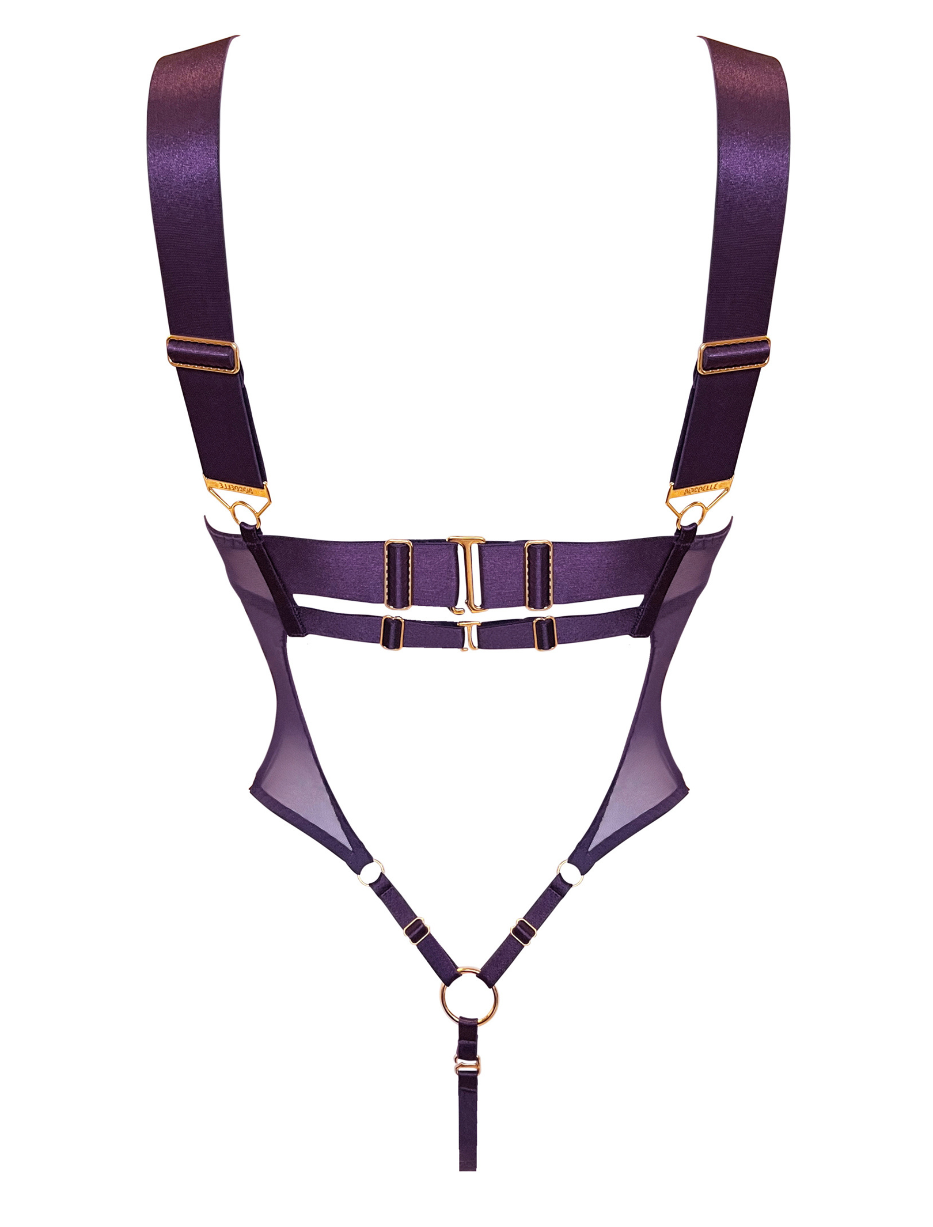A sheer mesh underwired bodysuit featuring soft wide band elastic bust straps for coverage. Fully adjustable for a personalised fit and adorned with 24k gold plated branded components, the thong strap is secured with a swan hook for ease when wearing.