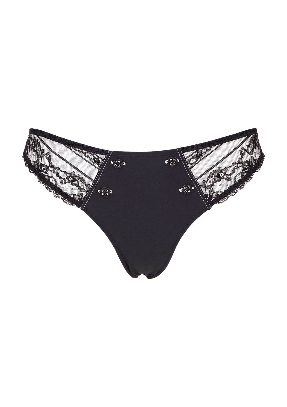 Mid-low waist tanga with seamless back for invisible wear. The Chantal Thomass nod: little flat lace pocket on the right buttock