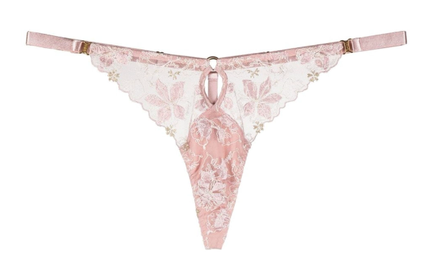 Vita floral-embroidered thong from BORDELLE featuring rose pink, stretch-design, embroidered design, tulle overlay, cut-out detailing and partial lining. Just a reminder that this piece must be tried on over your own garments.