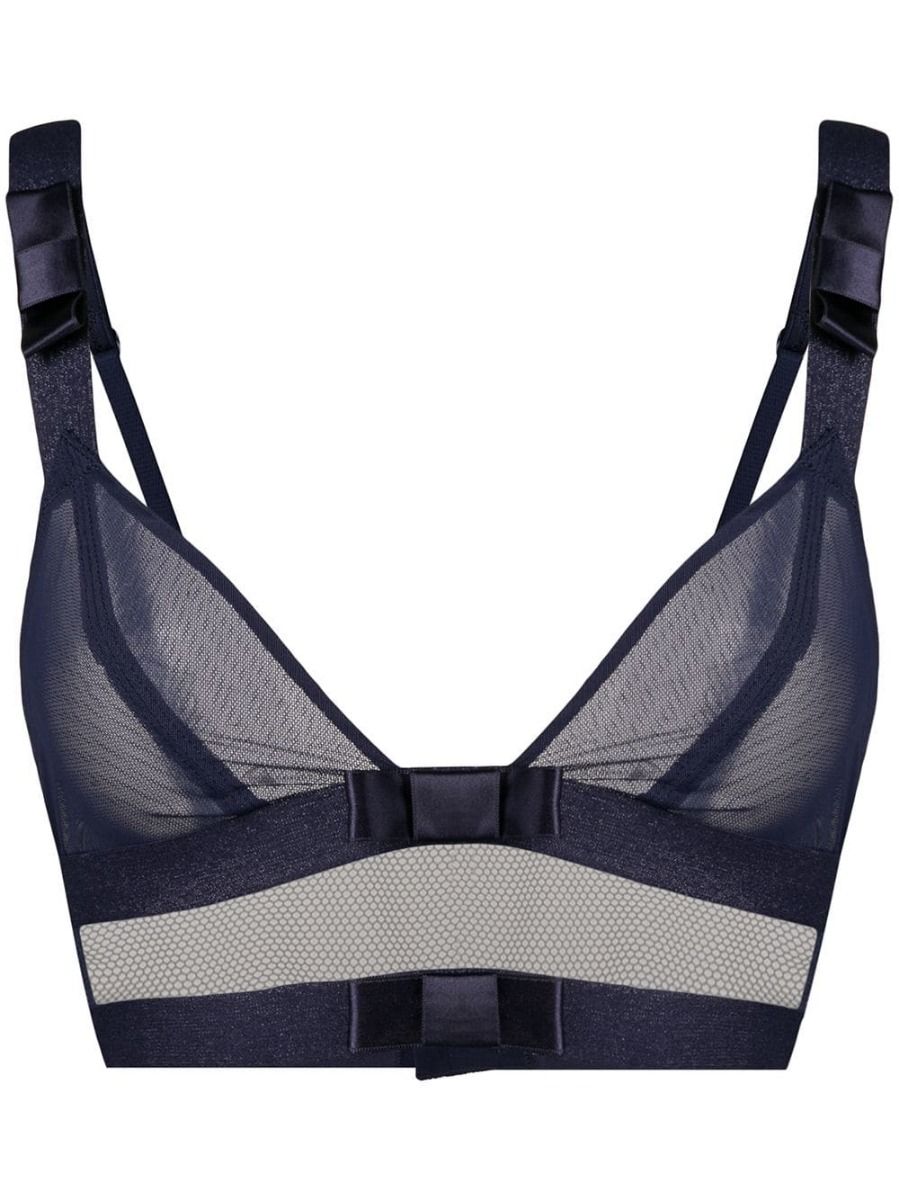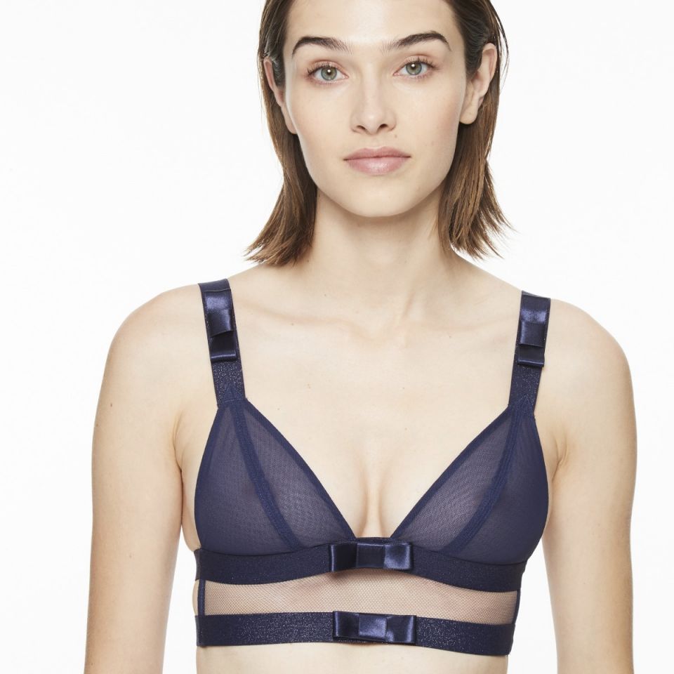 Audacieuse triangle bra lingerie range by Chantal Thomass sexy lingerie brand. Tulle line highlighted with wide, shiny elastic bands adorned with satin bows, beautifully arranged on a transparent mesh yoke. Elasticated front straps covered with a large shiny elastic band and adjustable back straps with the Chantal Thomass signature. Adjustable back closure.