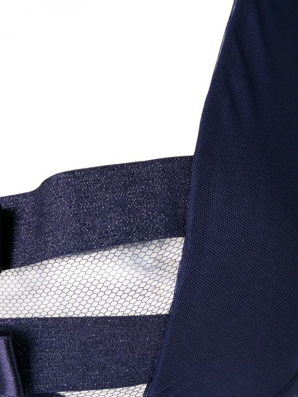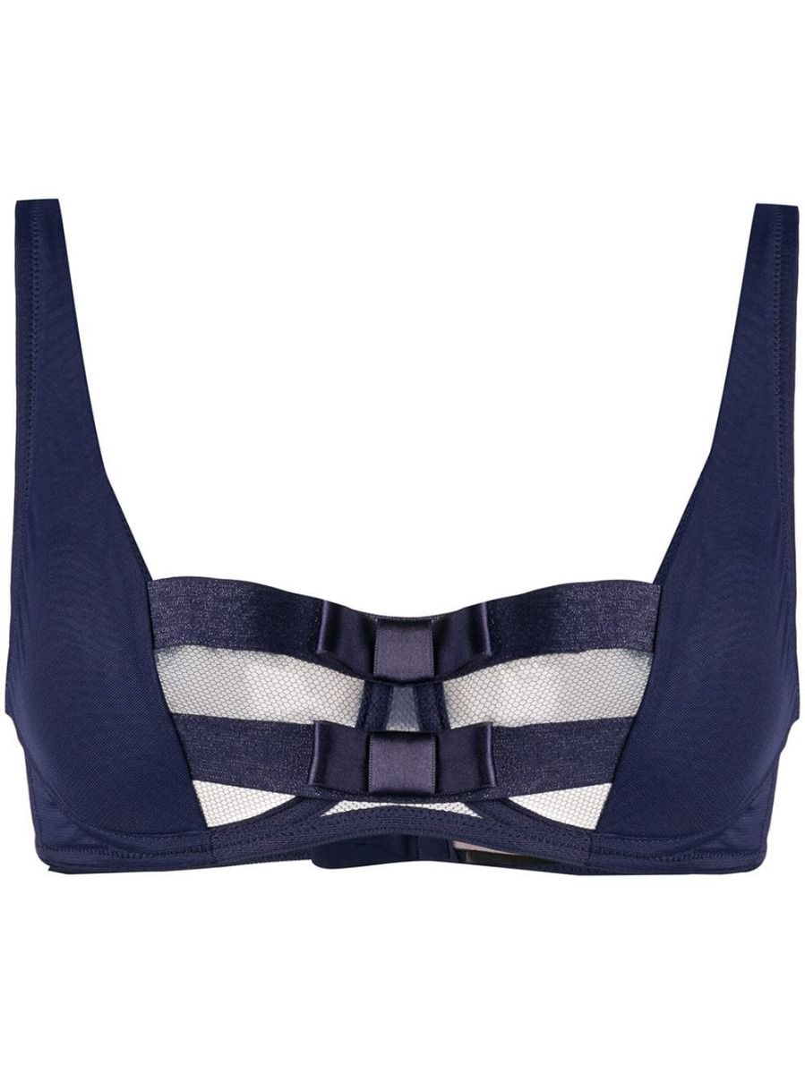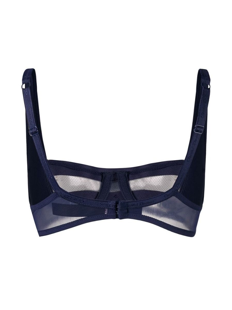 Audacieuse underwired full cup bra lingerie range by Chantal Thomass sexy lingerie brand. Tulle line highlighted with wide, shiny elastic bands adorned with satin bows, beautifully arranged on a transparent mesh yoke. Tulle-lined bra for enhanced support. Elasticated front straps covered with a large shiny elastic band and adjustable back straps with the Chantal Thomass signature. Adjustable back closure.