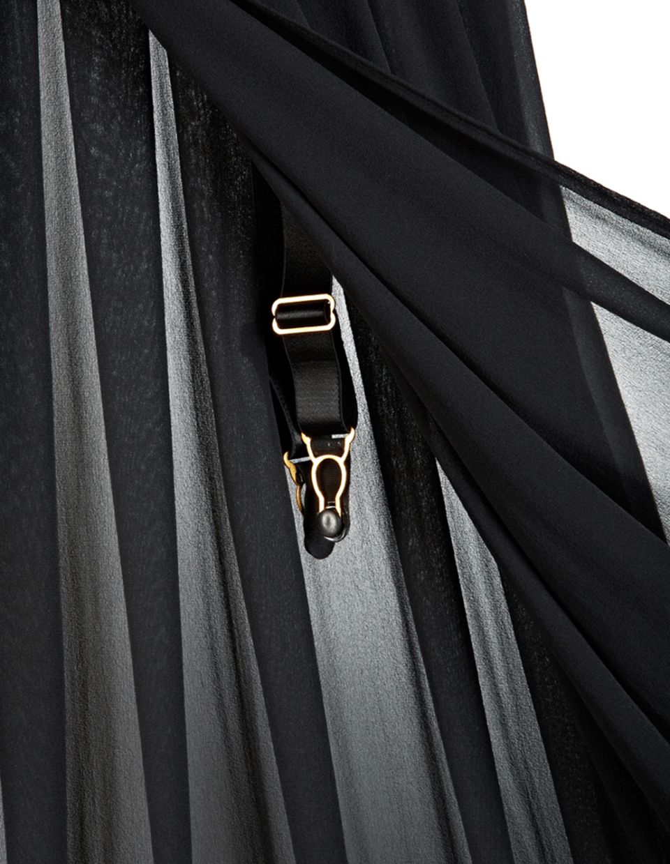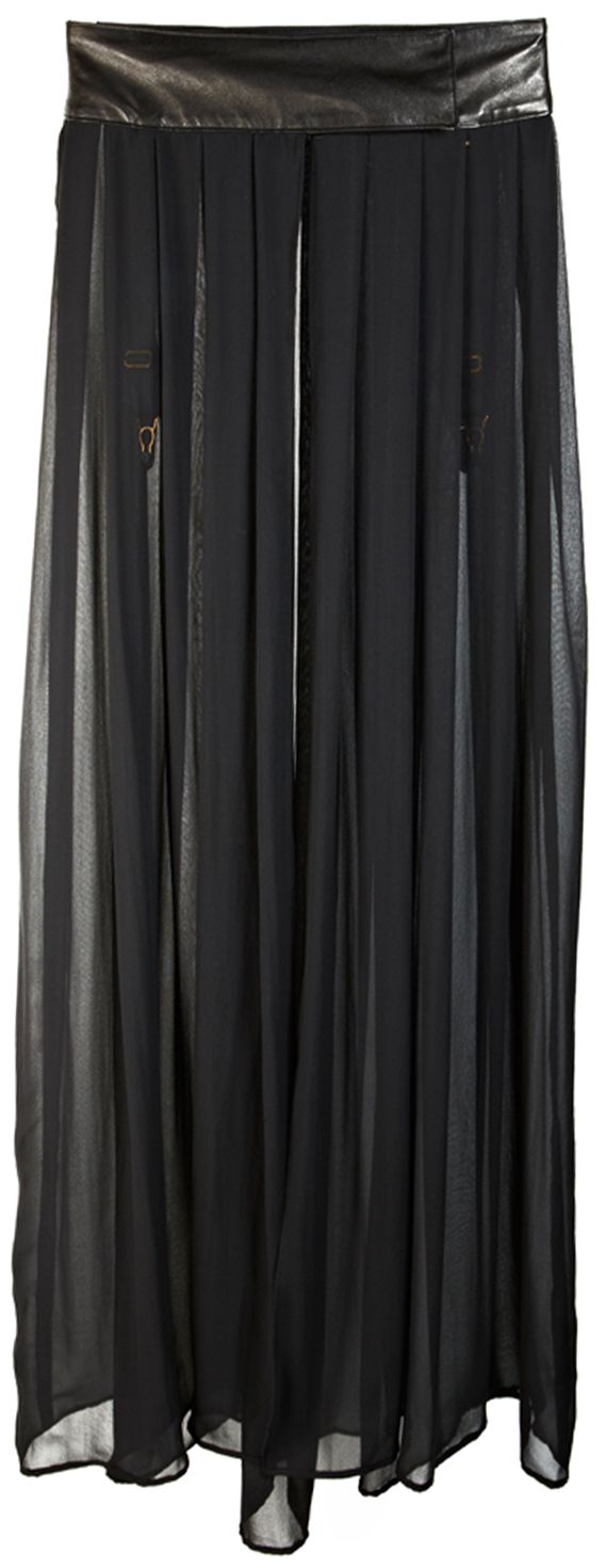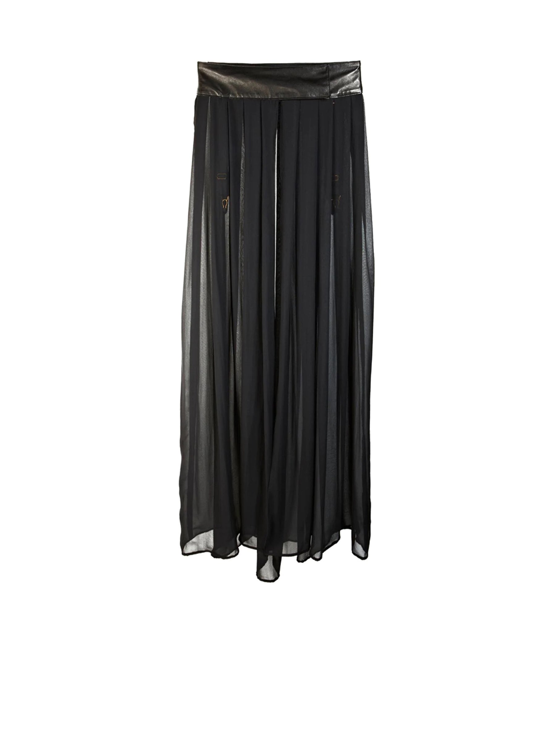 The statement piece of the Ava collection, this leather and silk floor length skirt captivates and charms. Meters of silk georgette are hand pleated around the waistline, meeting at the front to create a waist-high split. Soft silk lines the leather waistband and detachable suspender ends can be found on the inside, making this a sophisticated piece for both indoors and outdoors.