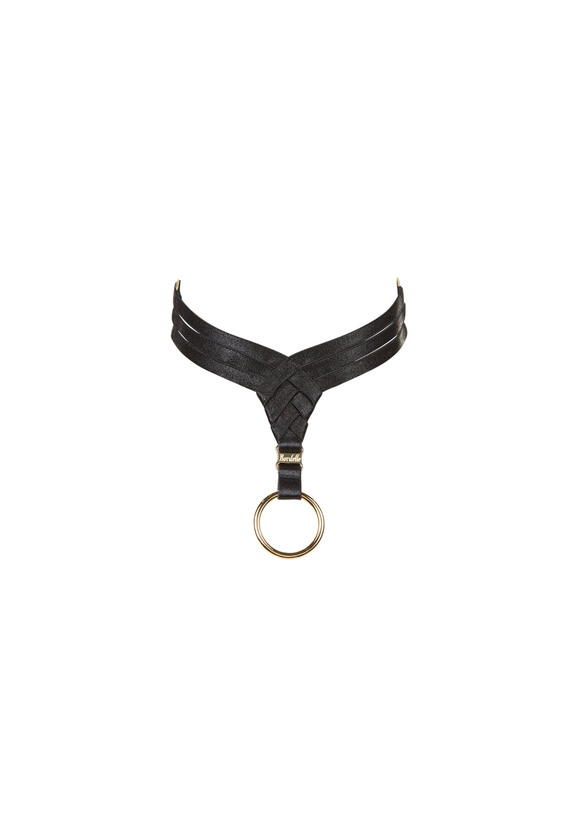 A signature Bordelle accessory this black collar is characterised by the hand-woven satin elastic detail, 24k gold plated branded connector and distinct oversized ‘O’ ring.