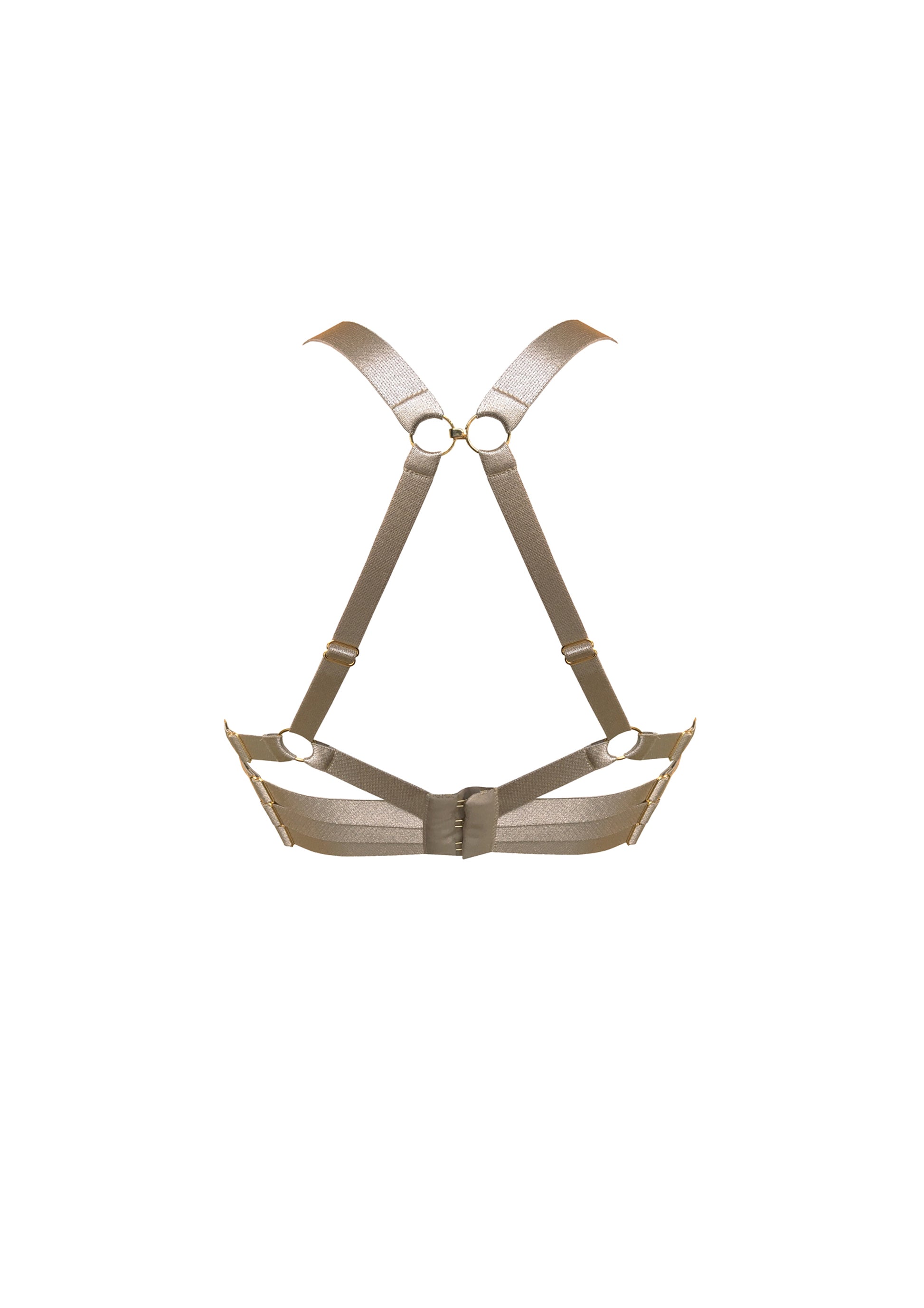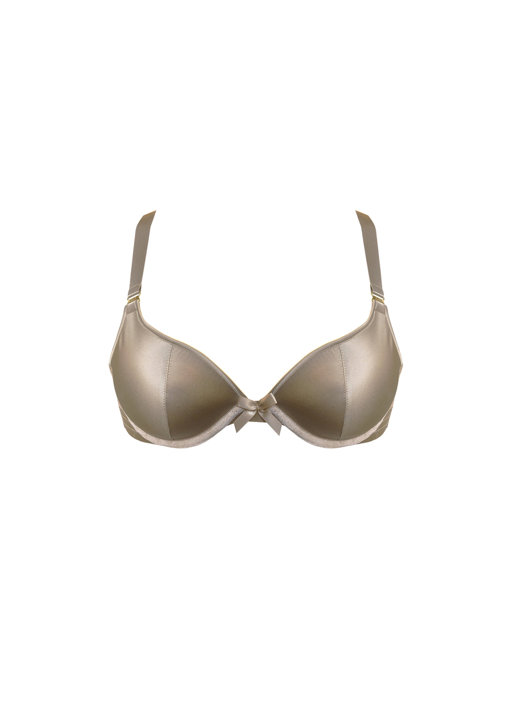 A caramel satin push-up bra silhouette featuring moulded cups covered in smooth silk and fully adjustable back straps. Secured with a hook & eye fastening at the center-back, with an additional hook near the top of the straps for optional extra 'push'.