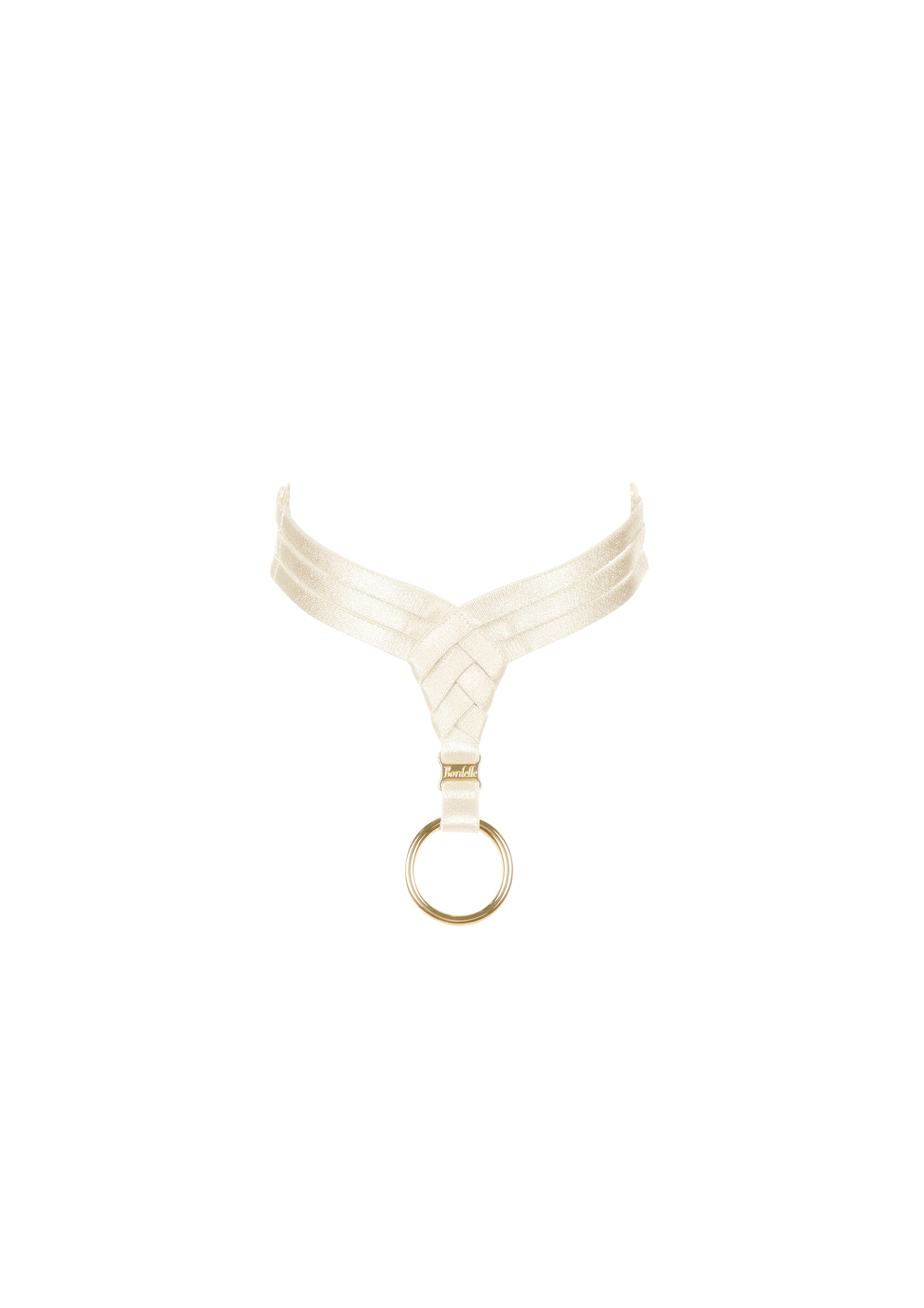 A signature Bordelle accessory this cream collar is characterised by the hand-woven satin elastic detail, 24k gold plated branded connector and distinct oversized ‘O’ ring.