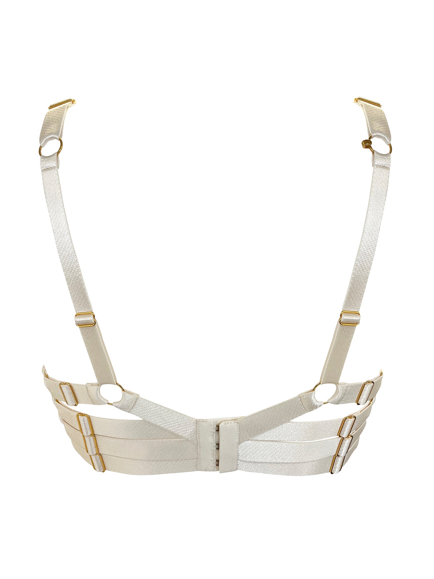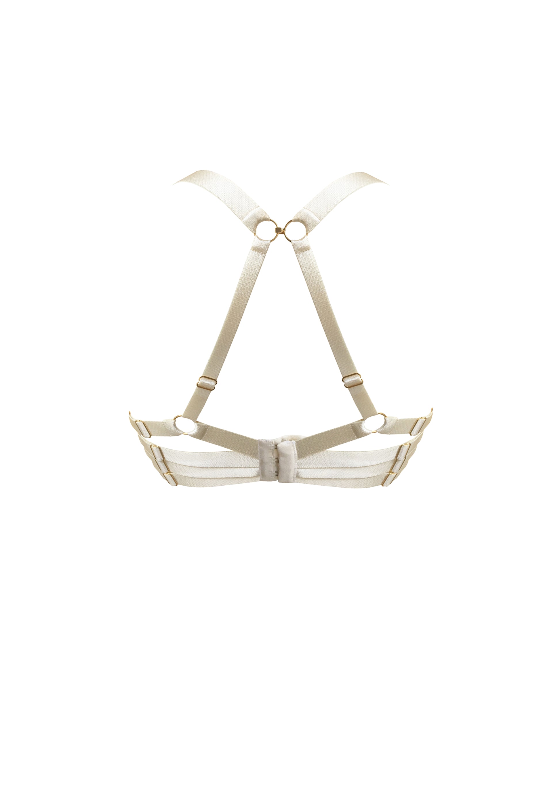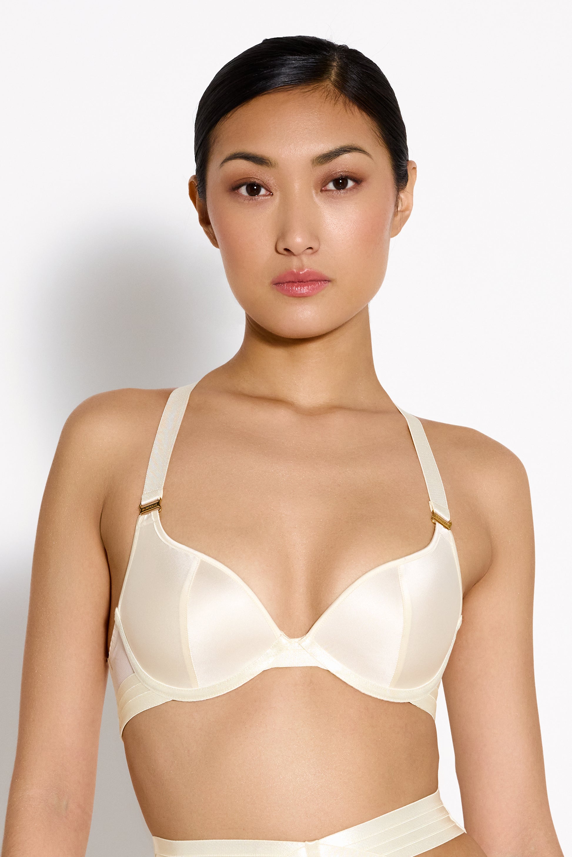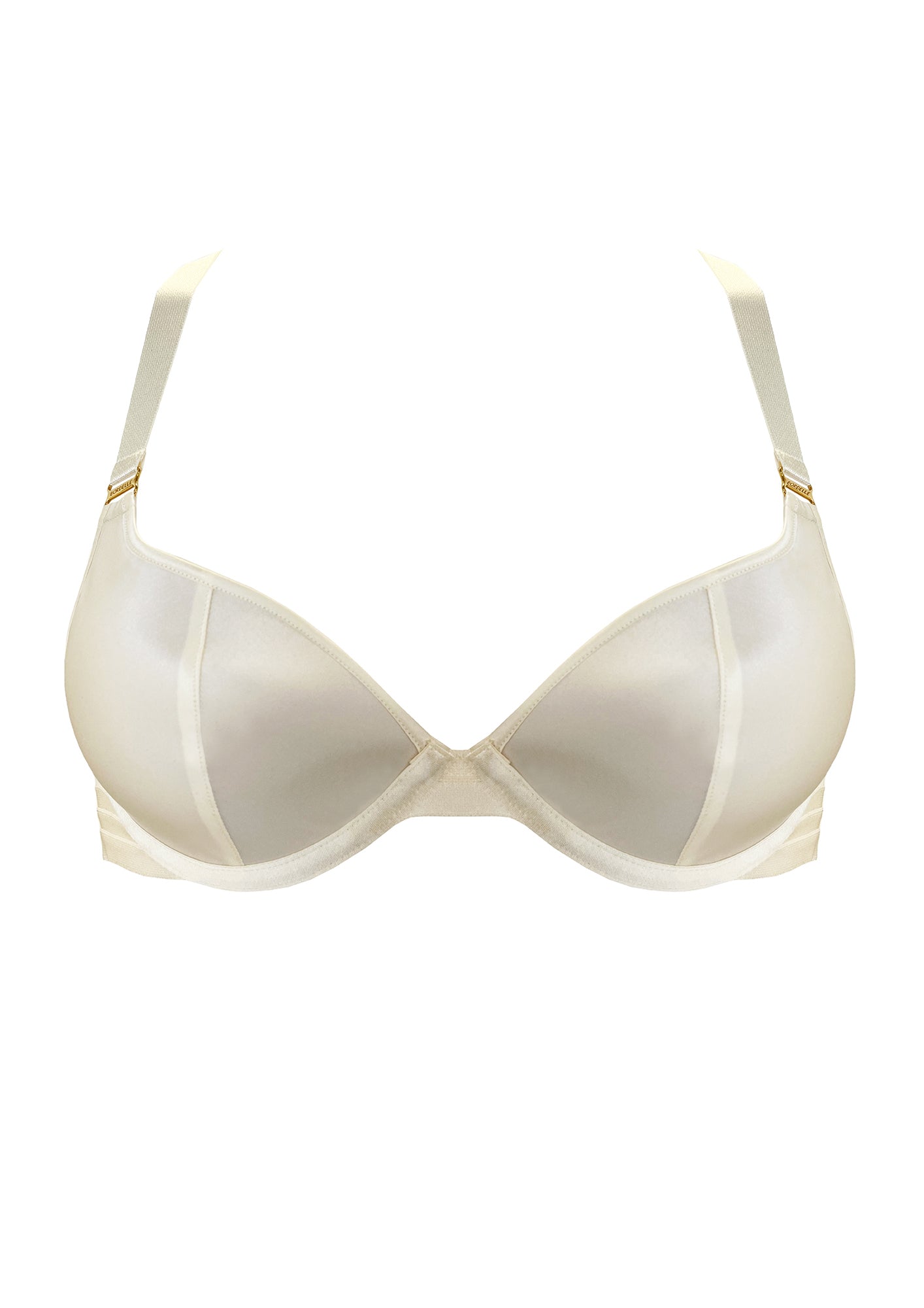 A cream satin push-up bra silhouette featuring moulded cups covered in smooth silk and fully adjustable back straps. Secured with a hook & eye fastening at the center-back, with an additional hook near the top of the straps for optional extra 'push'.