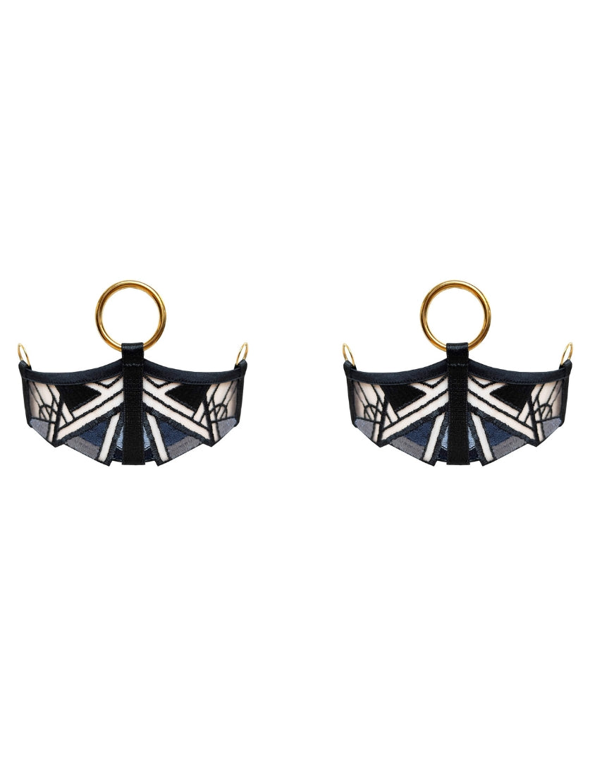 A pair of embroidered voile garters designed to match perfectly with any Cubism lingerie set, featuring 24k gold plated components and fully adjustable elastic strapping for a personalised fit. Attach to suspender clips via the 24k gold plated ‘o’ rings for both 6-strap suspender styles included in this collection.