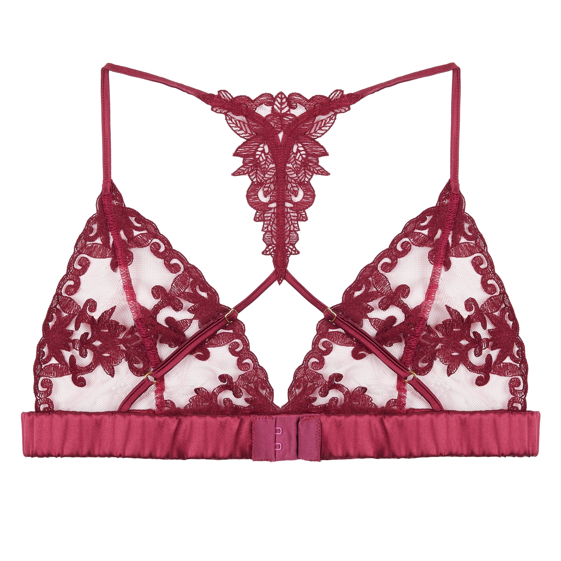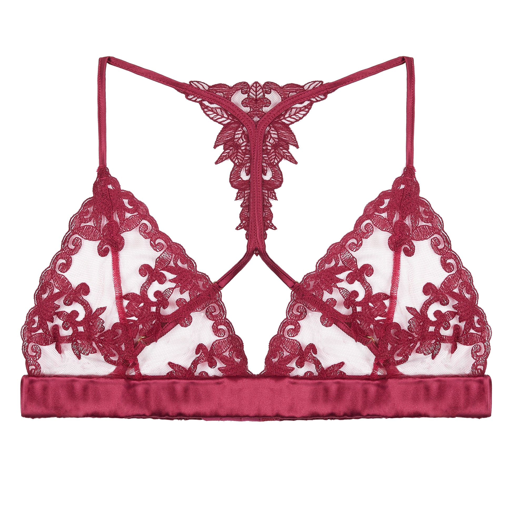 Our iconic soft-cup bra style is reimagined in a daring shade of cranberry, designed with Fleur’s bespoke embroidery inspired from the best-selling lingerie collection, Onyx. This luxurious lingerie pieces features bespoke embroidery delicately placed onto sheer Italian tulle, silk encased straps wrap gently around the shoulders to add a light support, finished with 24-carat gold plated hard ware adding a touch of opulence to a bold lingerie design.