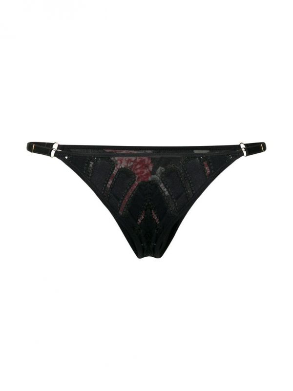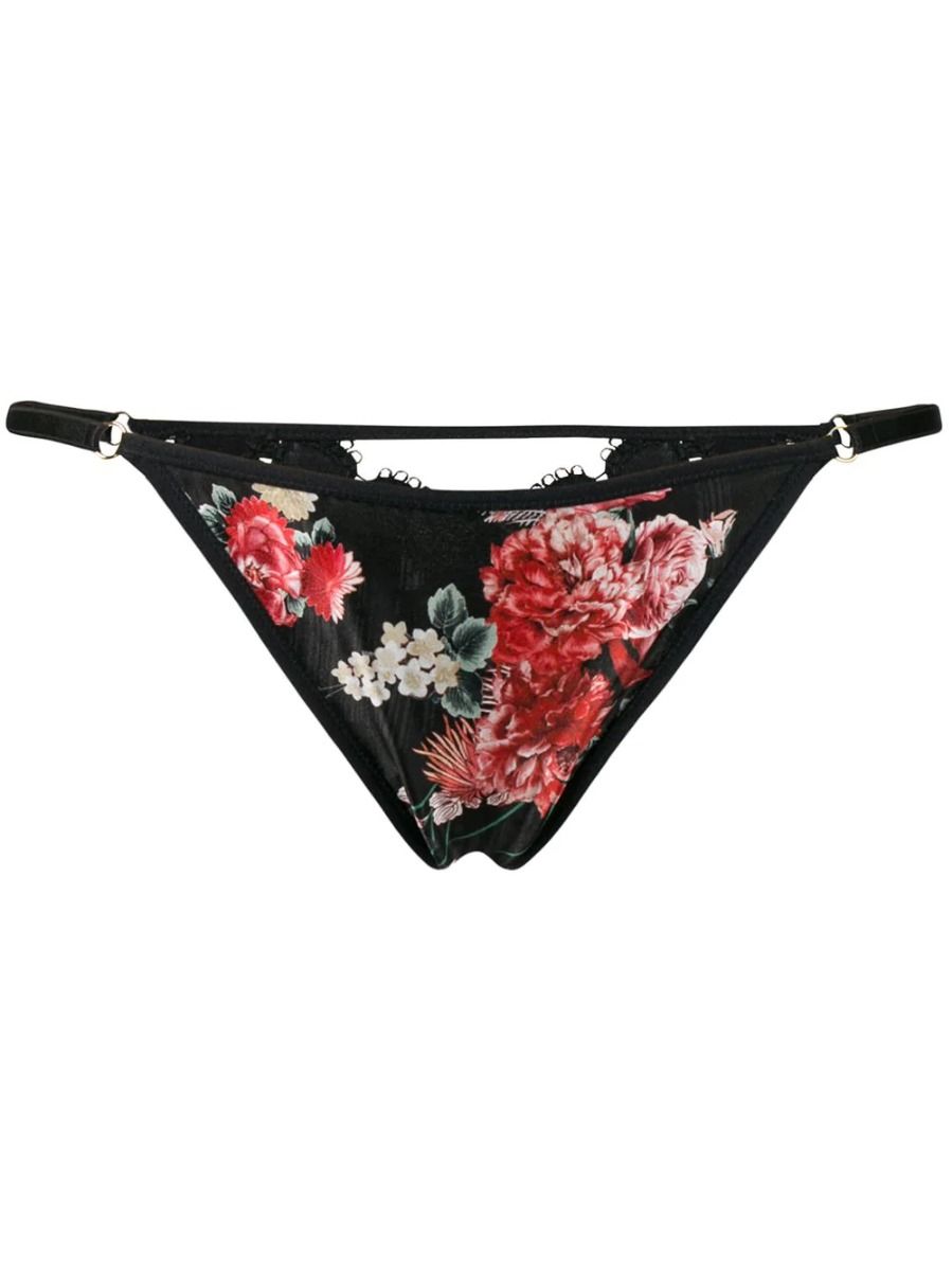 Black and red silk stretch and cotton Kim thong from Parah featuring a floral print. Underwear and lingerie must be tried on over your own garments.