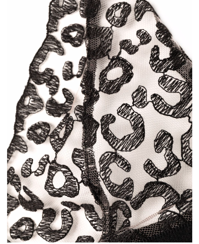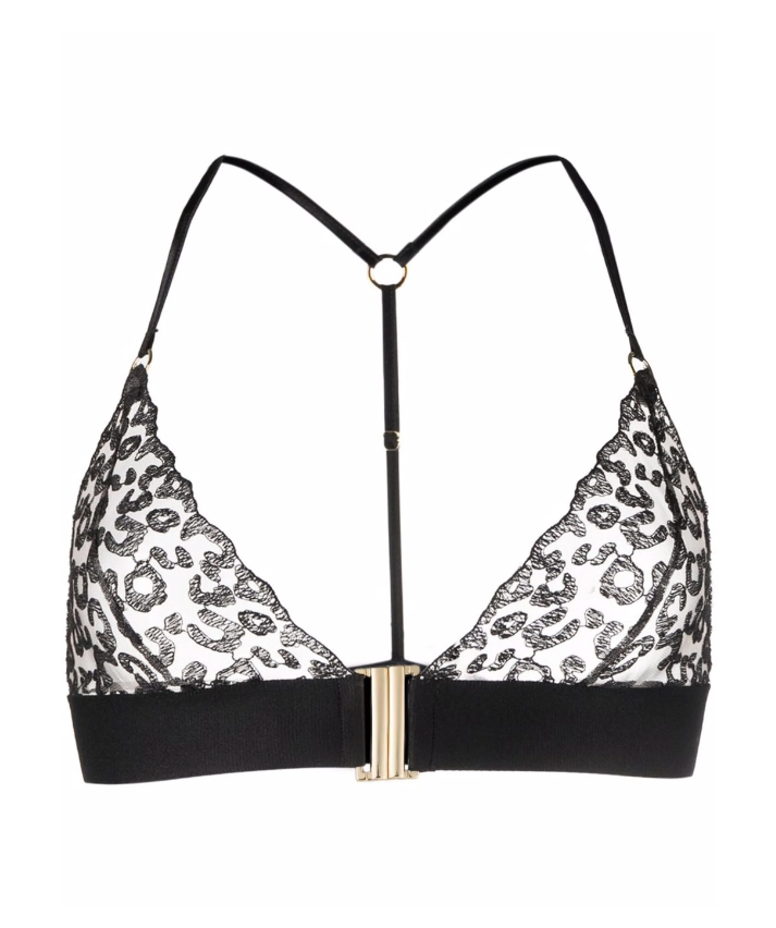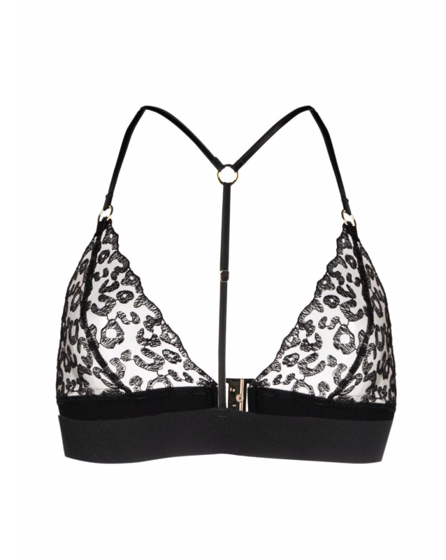 Black Kittie semi-sheer bra from FLEUR OF ENGLAND featuring pattern-lace detailing, semi-sheer construction, triangle cup, halterneck and hook fastening. Just a reminder that this piece must be tried on over your own garments.