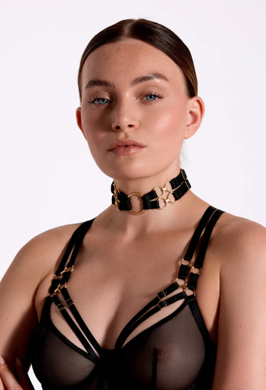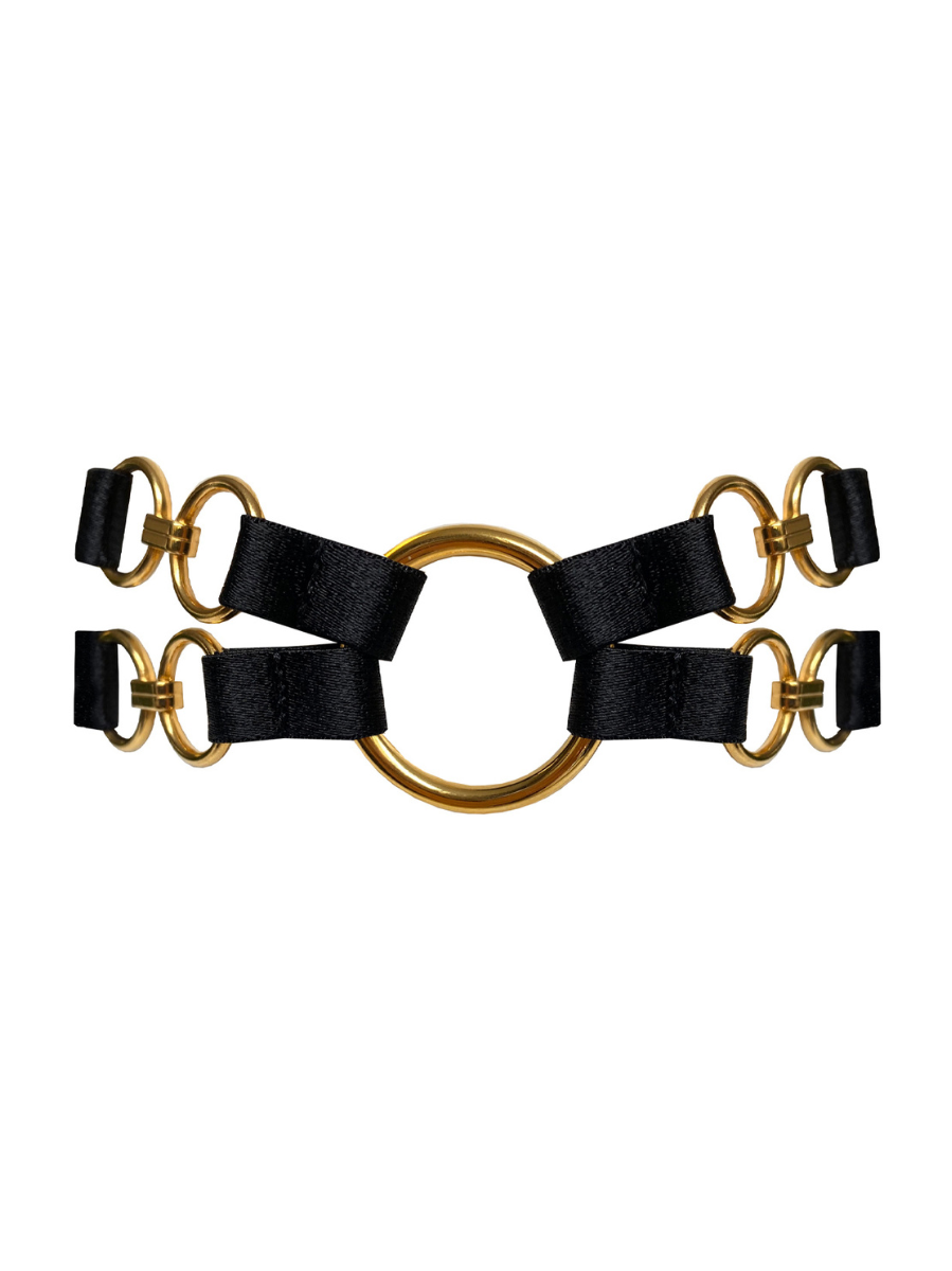 Featuring 4 of this season’s new standout 24k gold plated chain-link components, the Kleio Bondage Collar is the ultimate addition to any Bordelle look. The centre front oversized ‘O’ ring is bound to draw attention.