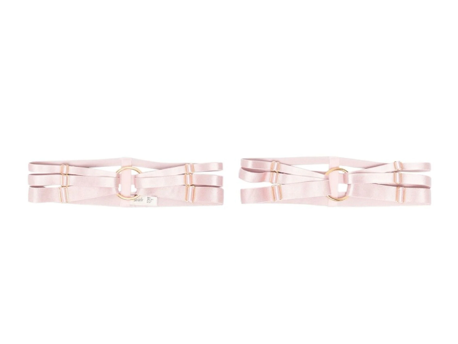 Rose multi-strap garters from BORDELLE featuring rose pink, stretch-design, gold-tone hardware, adjustable fit and oval hoop design.