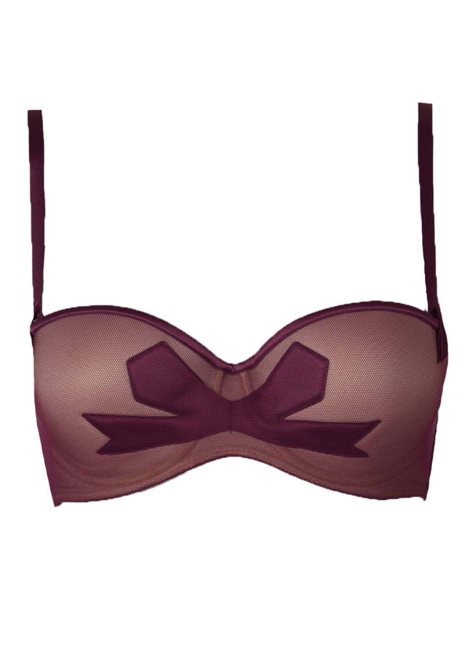 A moulded, padded balconette bra with removable straps. A beautiful, multiway balconette bra in a rich plum colour. The moulded cups give stunning shape, with or without straps. Finished with an adorable applique bow motif in the centre front.