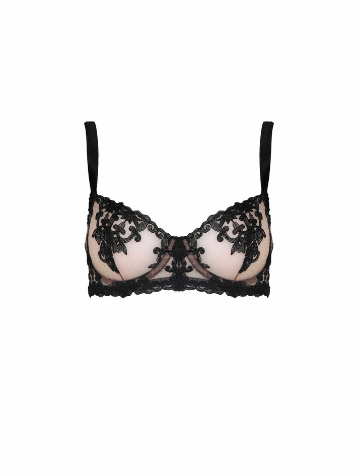 The Onyx underwired balcony bra is crafted in sheer Italian tulle with a beautiful bespoke black embroidery design. The sheer tulle melts away into your skin to create a tattoo effect with the intricate embroidery.