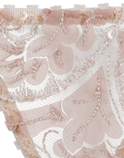 Blush Ophelia lace thong from Belle Et Bon Bon featuring a low rise, a slip-on style and bow embellishments.
