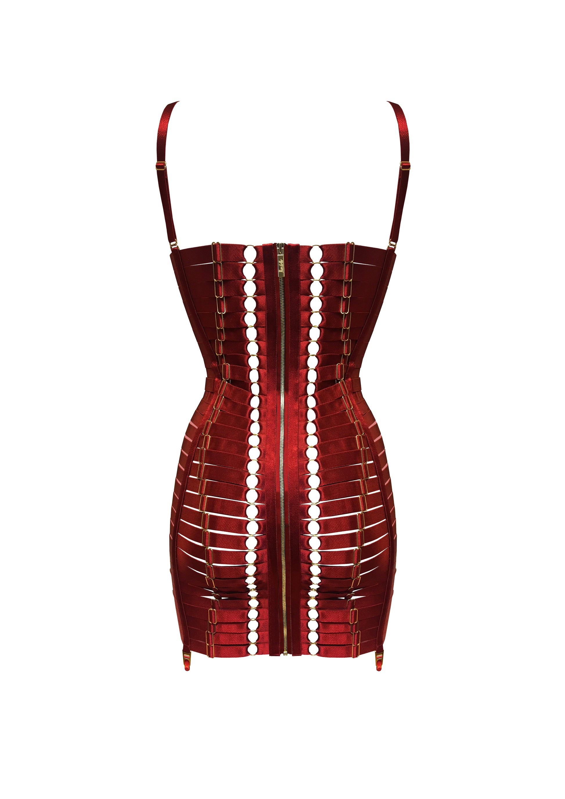 The Adjustable Angela Dress is the epitome of bondage-luxe – featuring more than one-hundred 24K gold plated components, this piece is the ultimate Bordelle showpiece. An iconic design, sophisticated and inspired, this dress uniquely adjusts to your figure to flatter every contour. Add this to your wardrobe and you will never regret it.