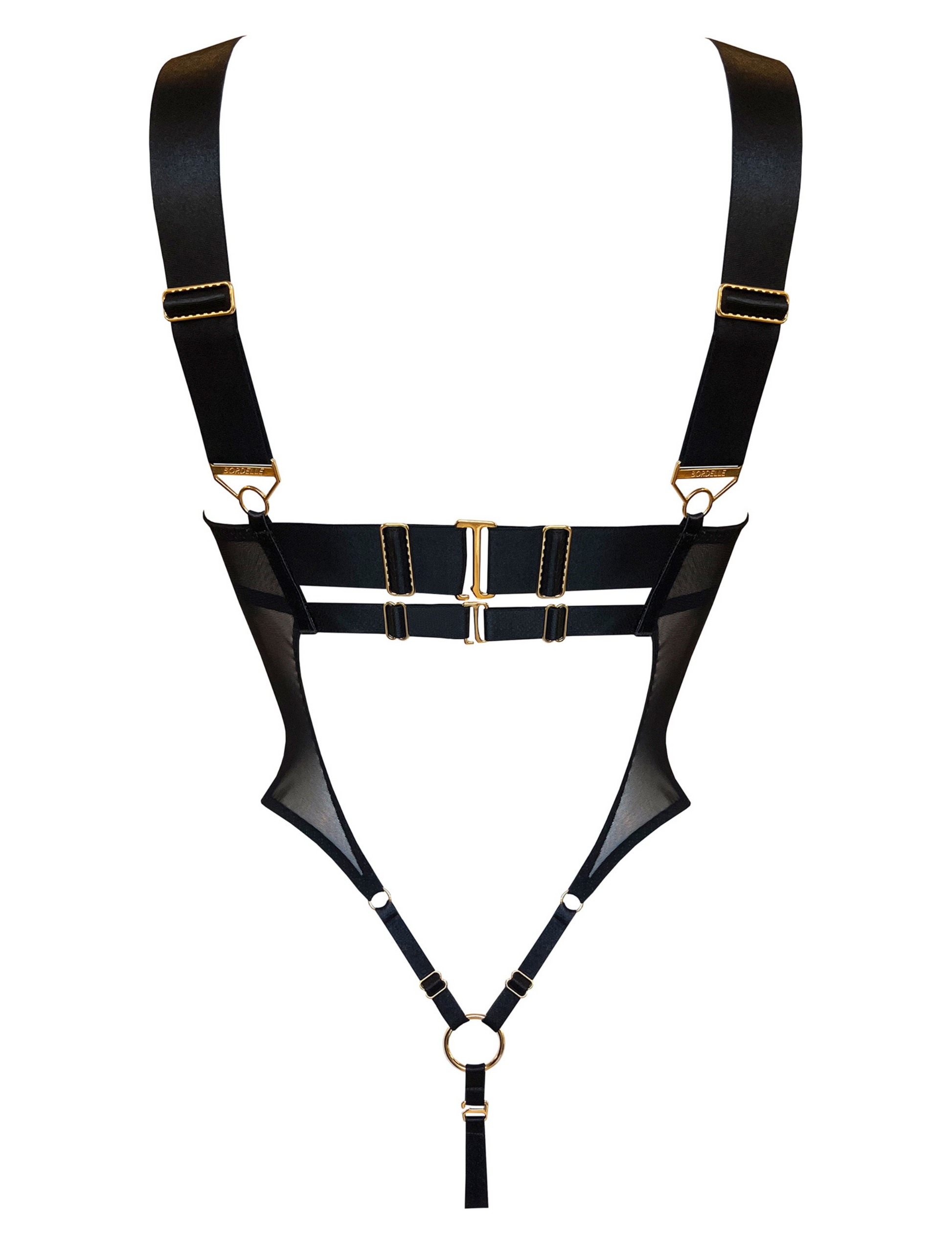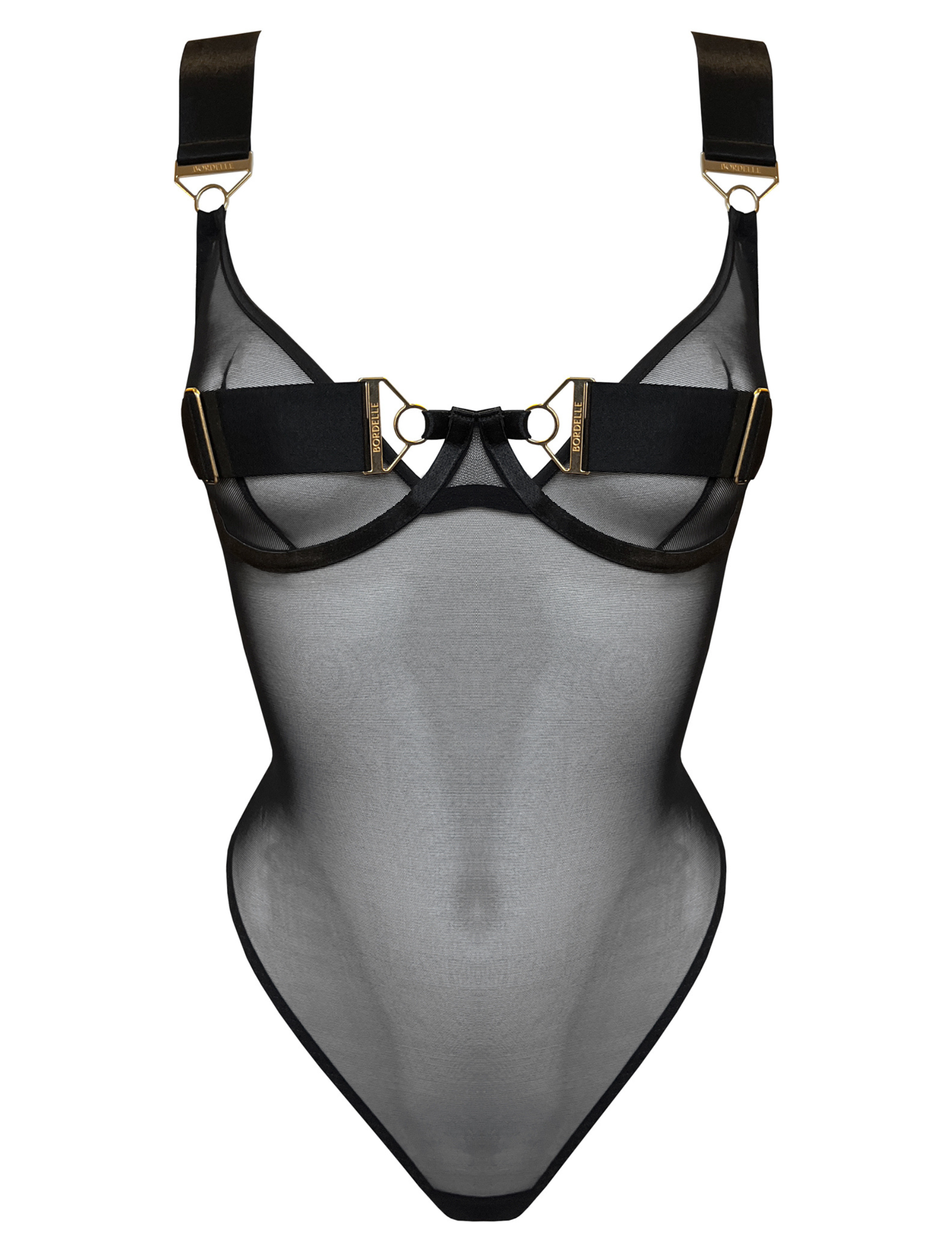 A sheer mesh underwired bodysuit featuring soft wide band elastic bust straps for coverage. Fully adjustable for a personalised fit and adorned with 24k gold plated branded components, the thong strap is secured with a swan hook for ease when wearing.