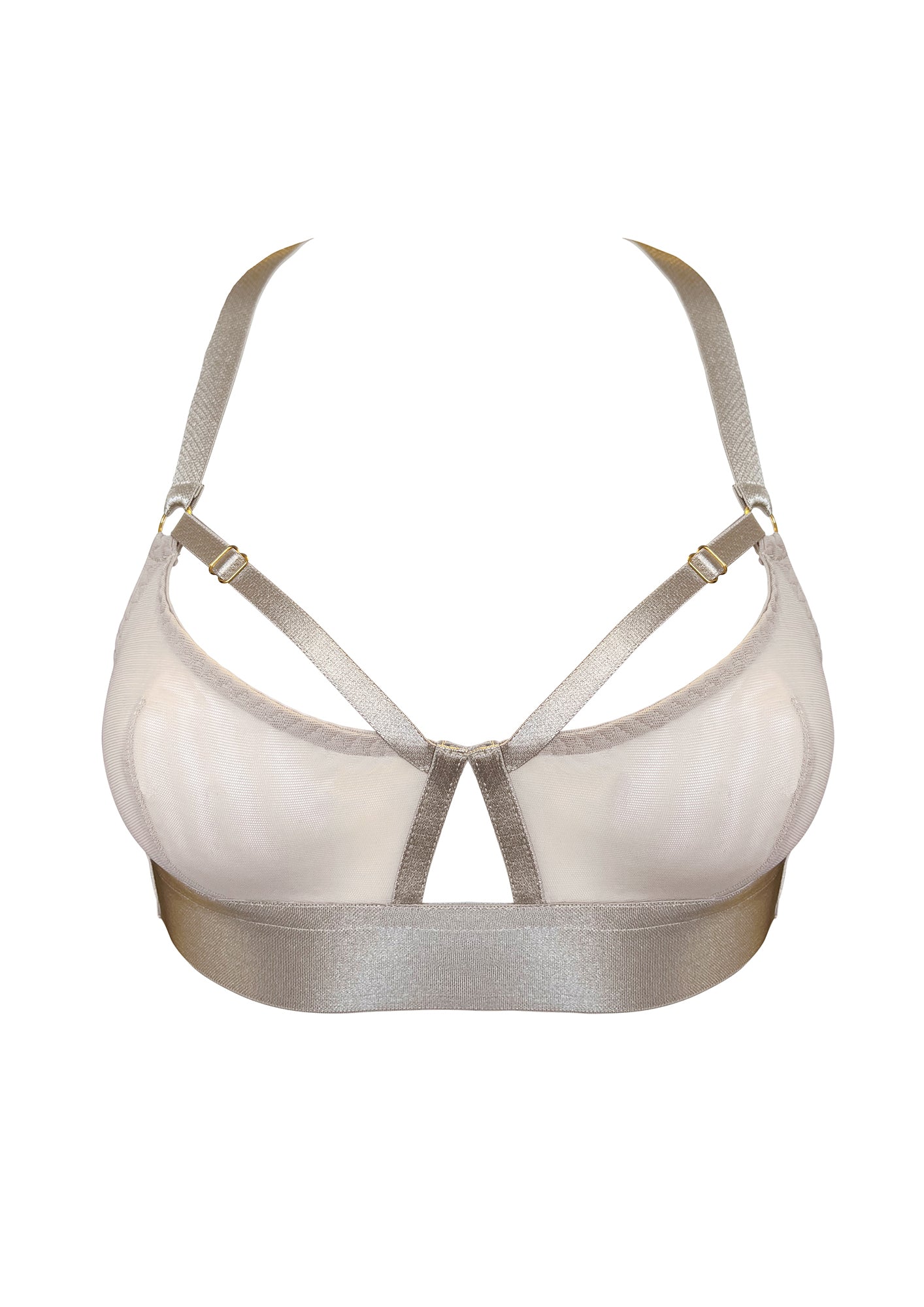 A non-wired darted soft cup bra in soft sheer mesh, double layered for coverage, with a centre front peep detail. The soft wide band elastic underband offers comfort and gentle support, a style suitable for everyday wear.