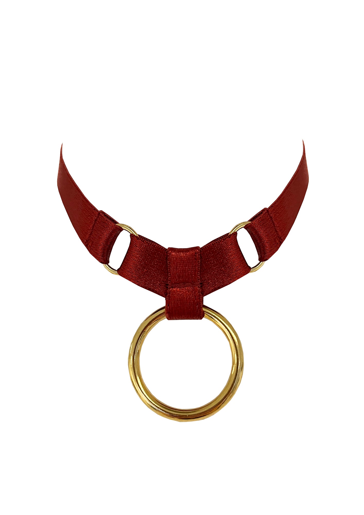 This satin elastic strap collar featuring an oversized 24k gold plated ‘O’ ring is the perfect lingerie accessory. Fully adjustable at the back and fastened with a 24k gold plated swan hook, this style is the finishing touch to any Signature look.
