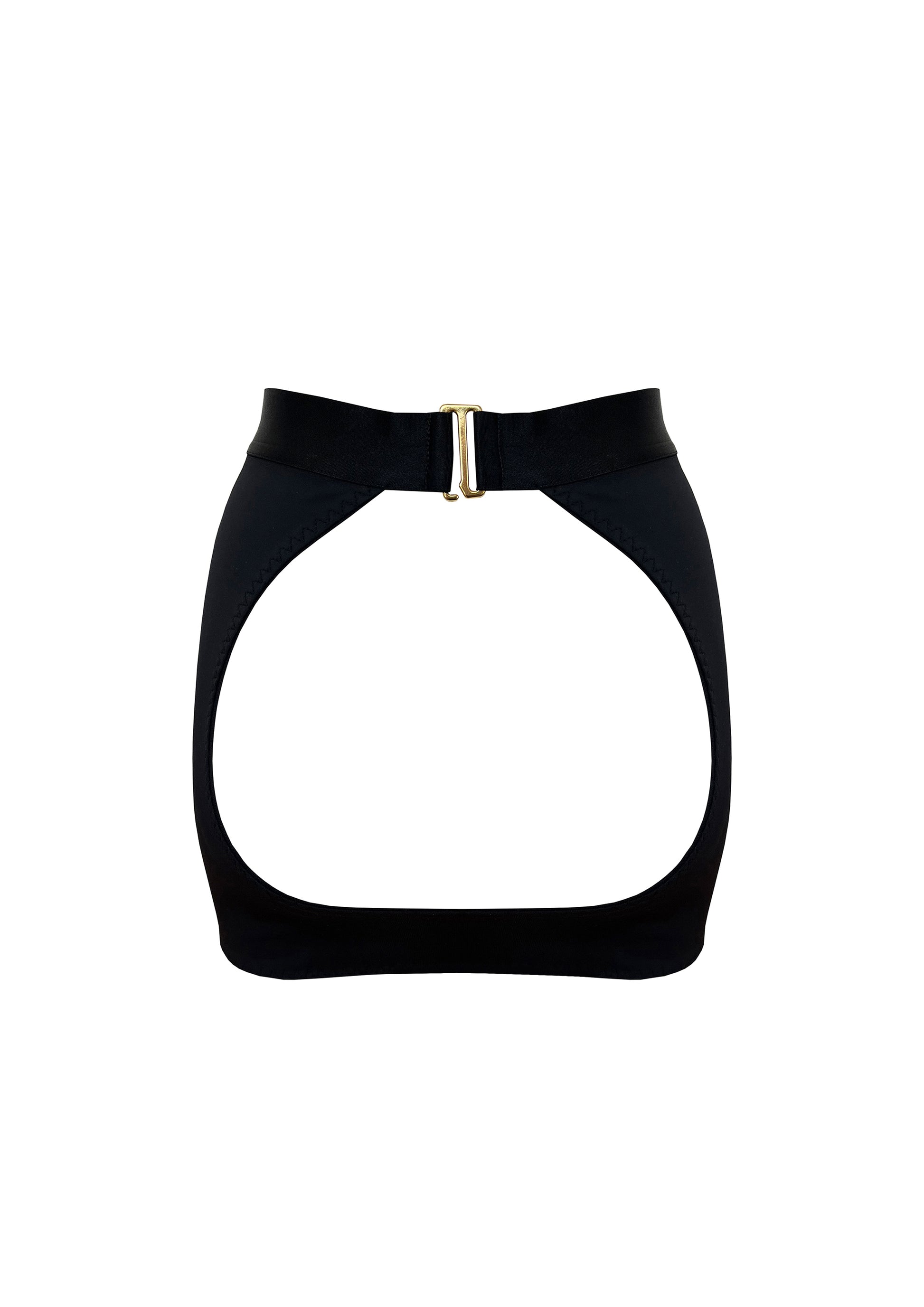 An opaque jersey skirt that is covered at the front, open at the back and perfect to mix-and-match with layered looks. The wide band elastic waistband is secured with a 24k gold plated swan hook, and the flattering curves of the open back are guaranteed to catch attention.