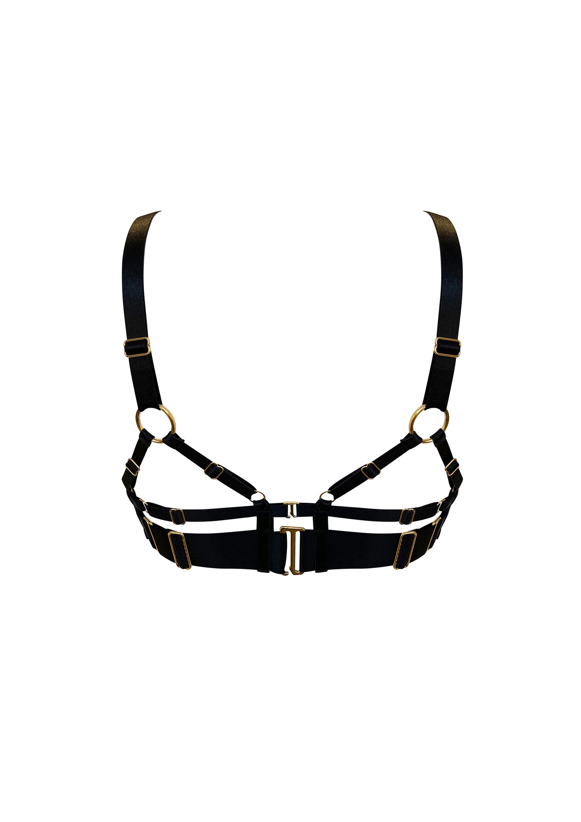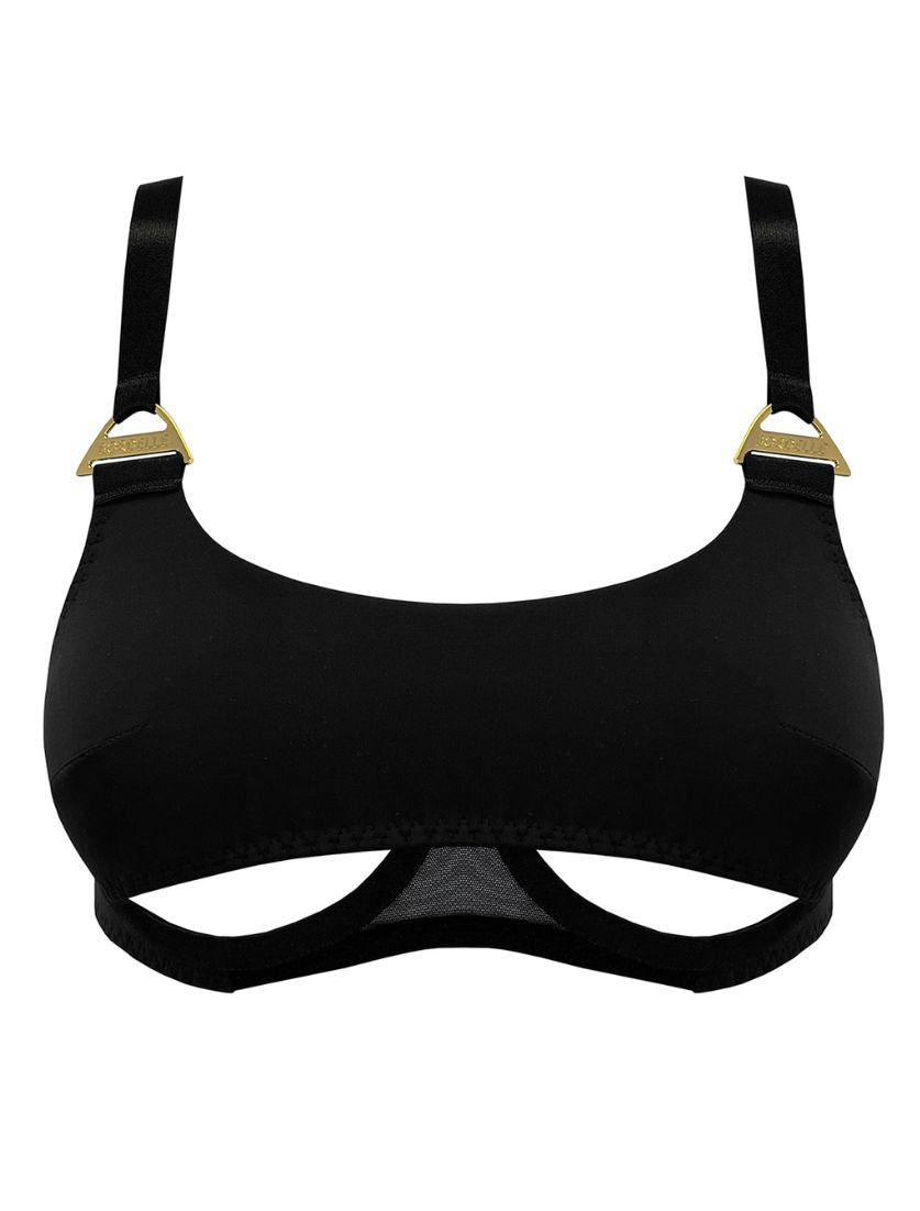 A super-soft jersey wire bra with underbust peep. The scoop neckline is connected to the shoulder straps via our new 24k gold plated oversized component. Wear at home or dare to show off when paired with outerwear.