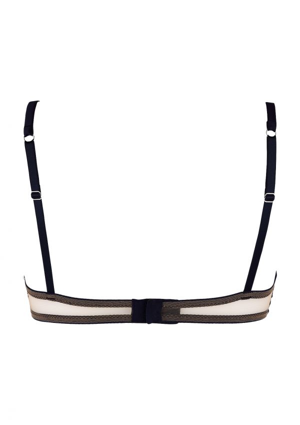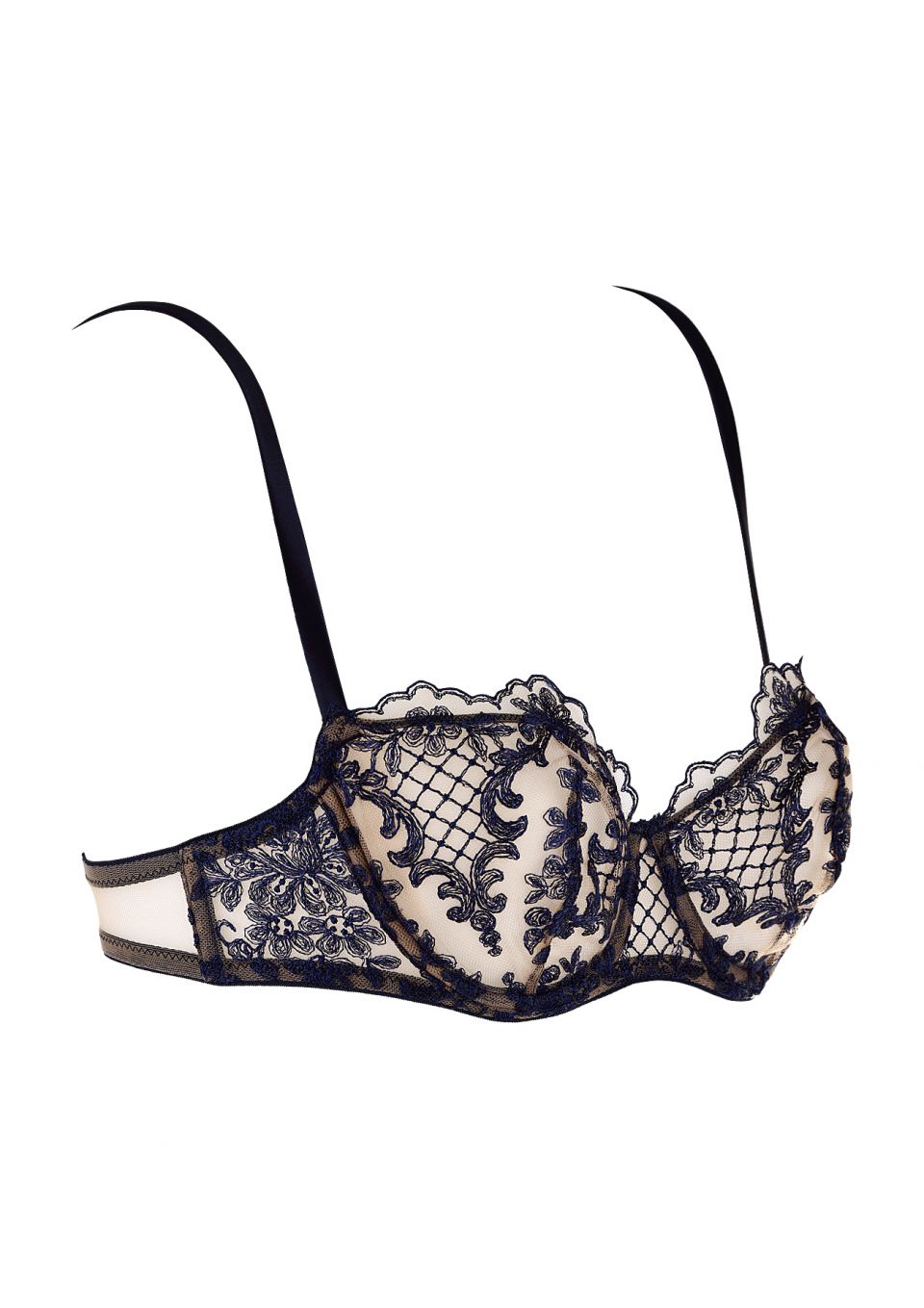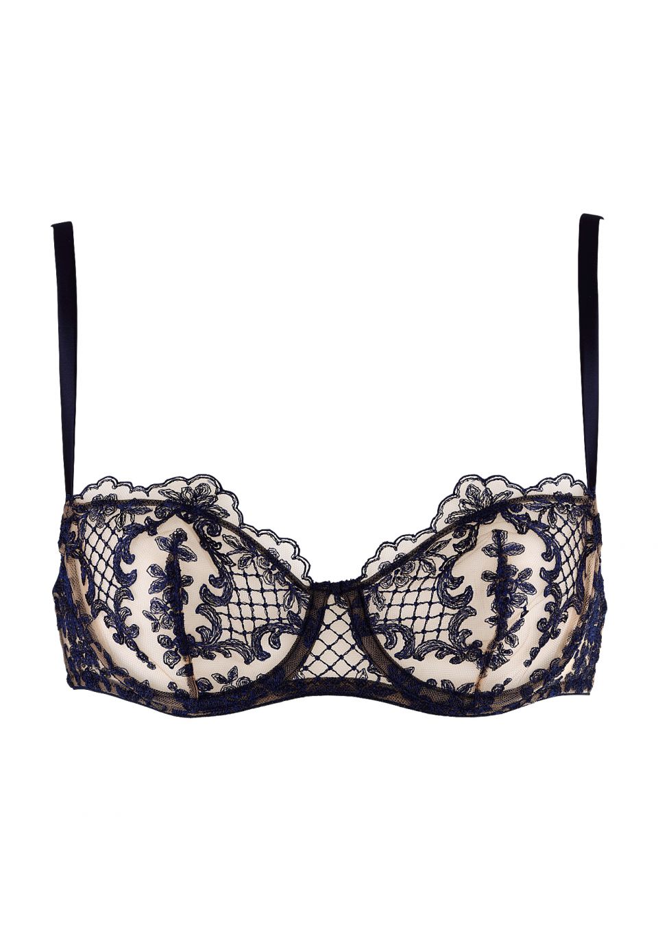 A flattering underwired bra with silk satin straps and deep blue embroidered lace on delicate tulle cups.