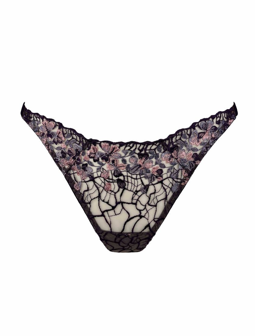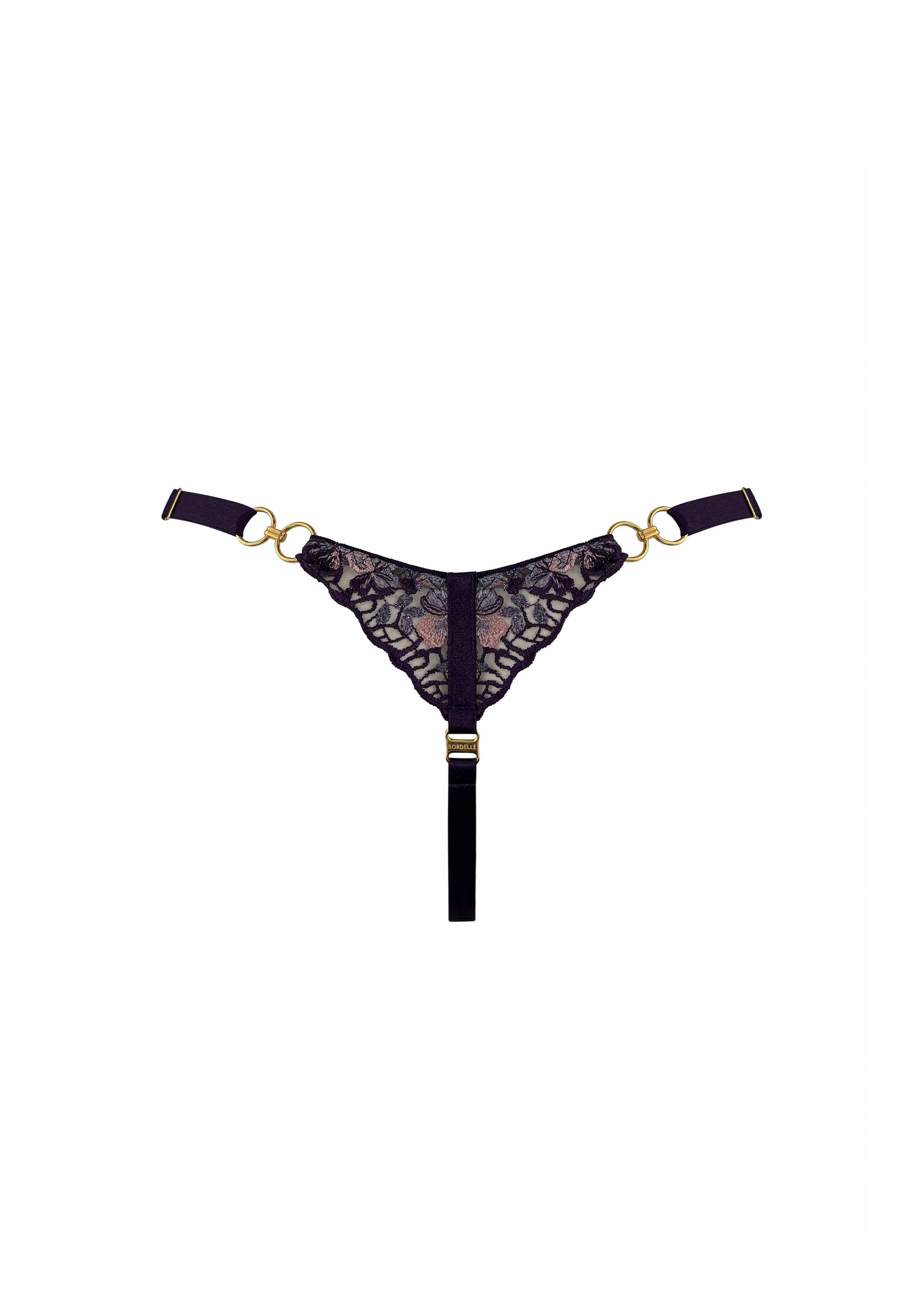 An elevated lace thong featuring a delicate embroidered voile detail panel at the back and multiple 24k gold plated chain-link components. It’s flattering high-leg design allows the adjustable hip straps to smooth delicately over the hips.