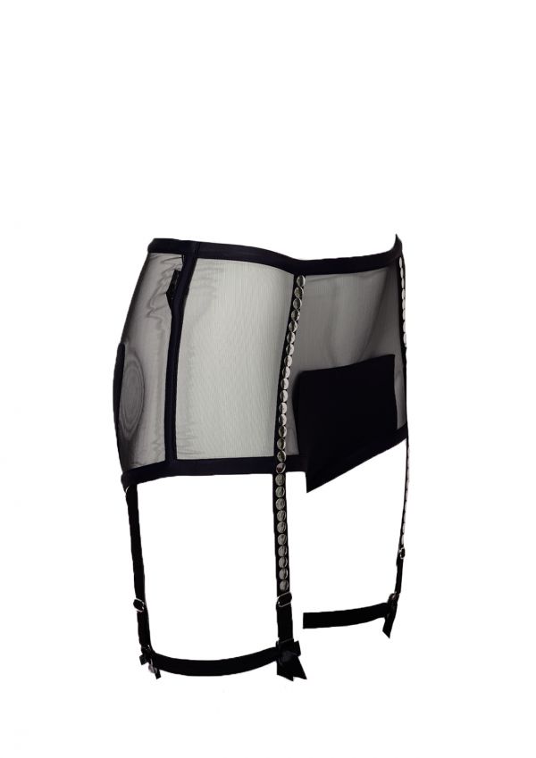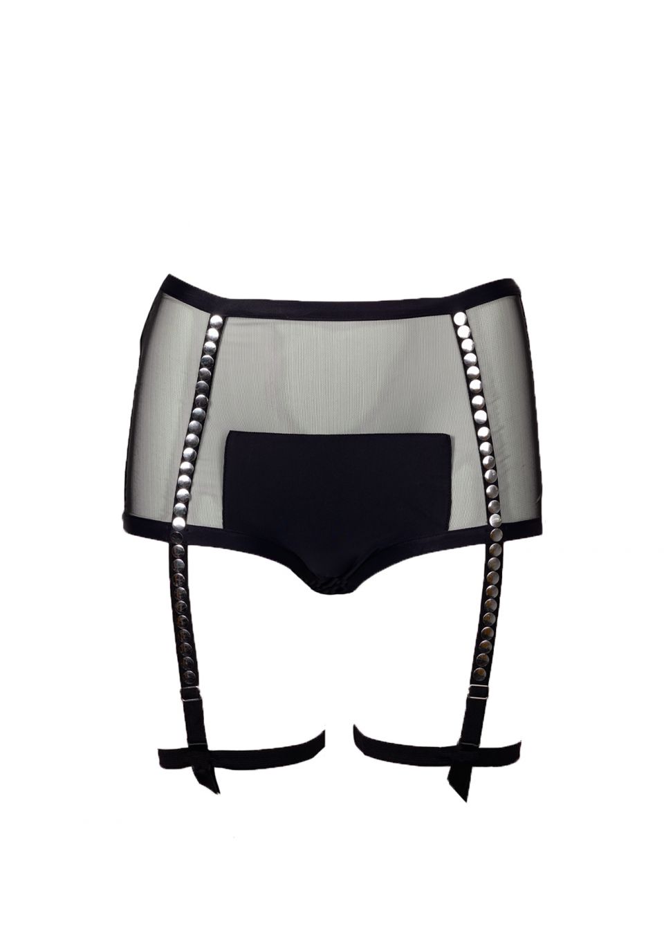 Retro-cut suspender briefs with a truly modern twist. The sheer mesh gives a sensationally sexy look, whilst iconic angular black panels and four rows of silver studs give a hard-edged feel.