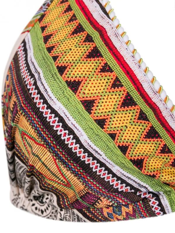 Multicoloured Aztec bikini from Parah featuring a bikini top with a back tie fastening and a clasp fastening and a pair of bikini bottoms with side tie fastenings.