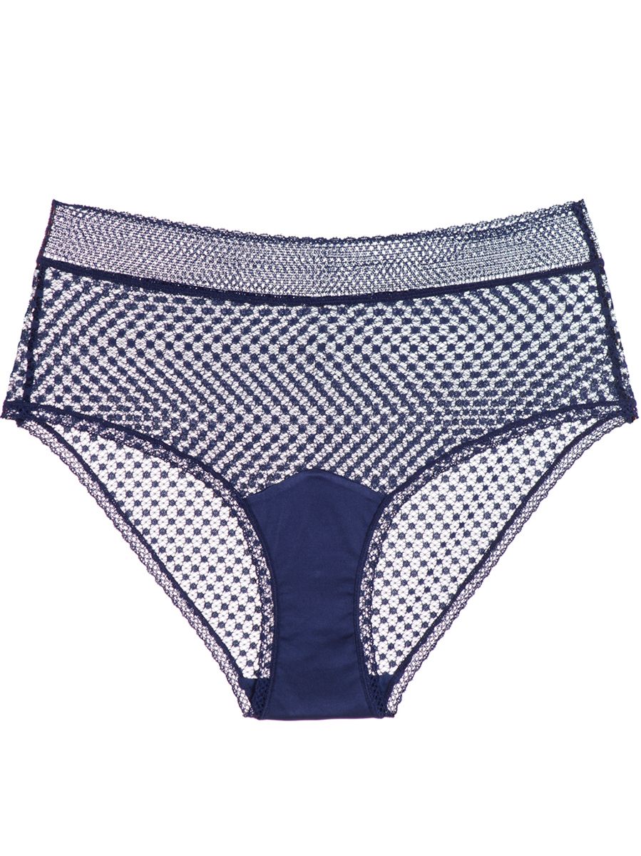 The high waist silhouette lends a conservative contrast to the sheer mesh—or does it just make it more enticing? Wide, sheer waistband gives light support—physically and visually.