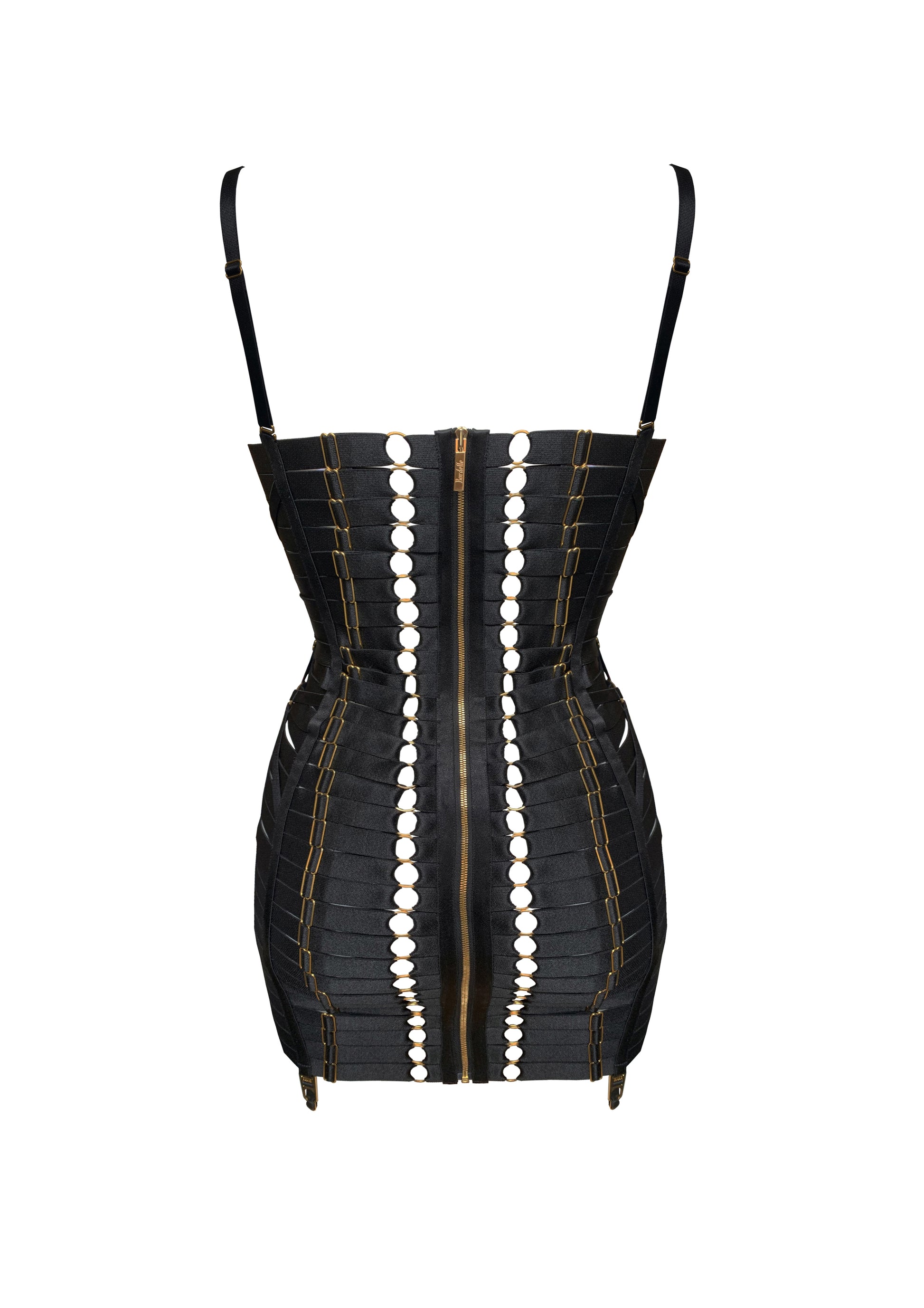 Introducing the Adjustable Luxe Bondage Angela, the epitome of Bordelle's exquisite bondage craftsmanship, meticulously designed to enhance every curve. This remarkable ensemble is meticulously crafted with more than 150 components, each plated with 24k gold. The creation process for each dress spans an entire day, ensuring unparalleled attention to detail and quality.