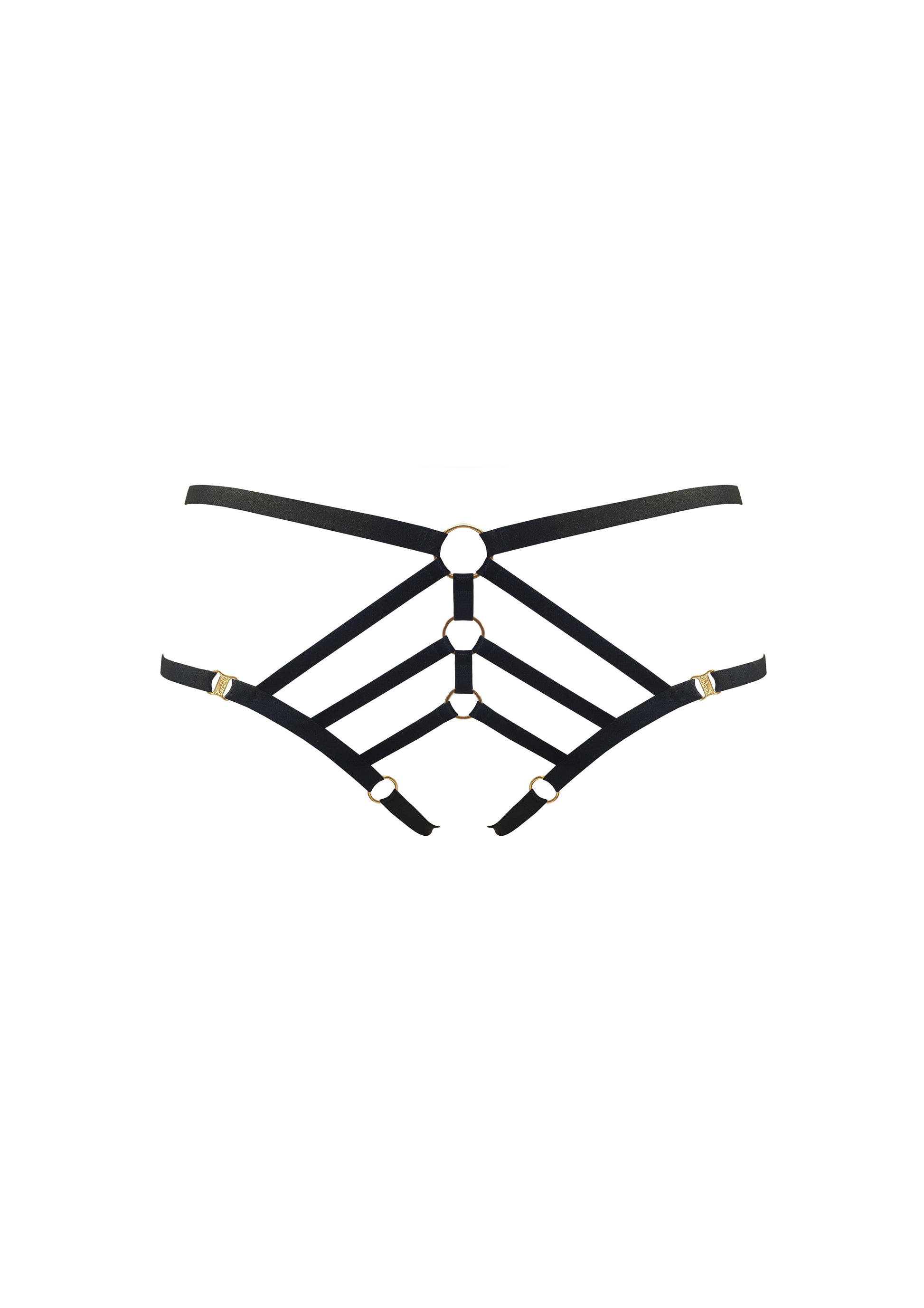 Elevate your lingerie collection with Bordelle's Signature black satin elastic strapping and 24k gold plated hardware brief. Fully adjustable and versatile, it makes an ideal gift. Wear it alone or layer it over your favourite Bordelle pieces for a captivating look.