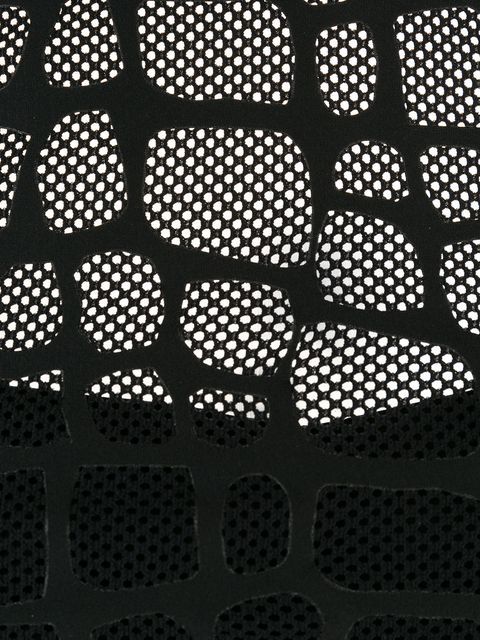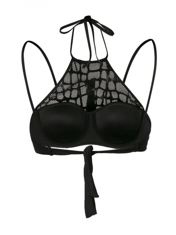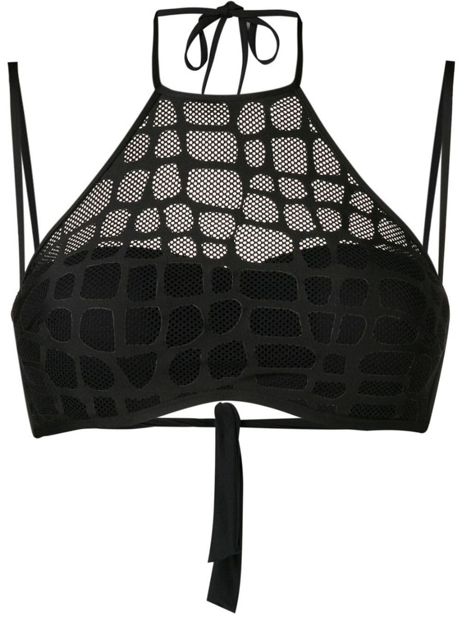 Black caged mesh bikini top from Parah featuring a halterneck, double straps, a grid pattern and back tie fastenings.