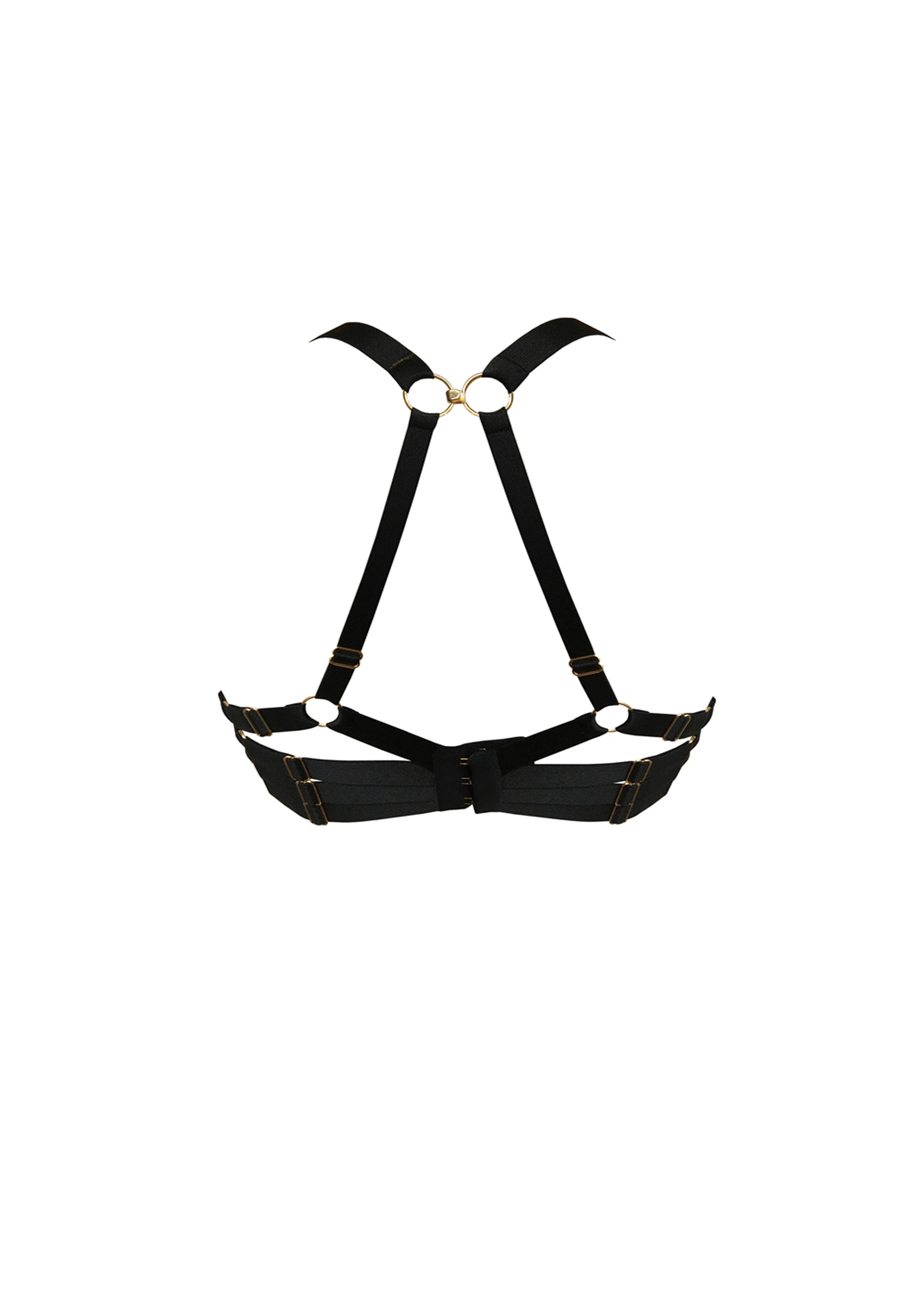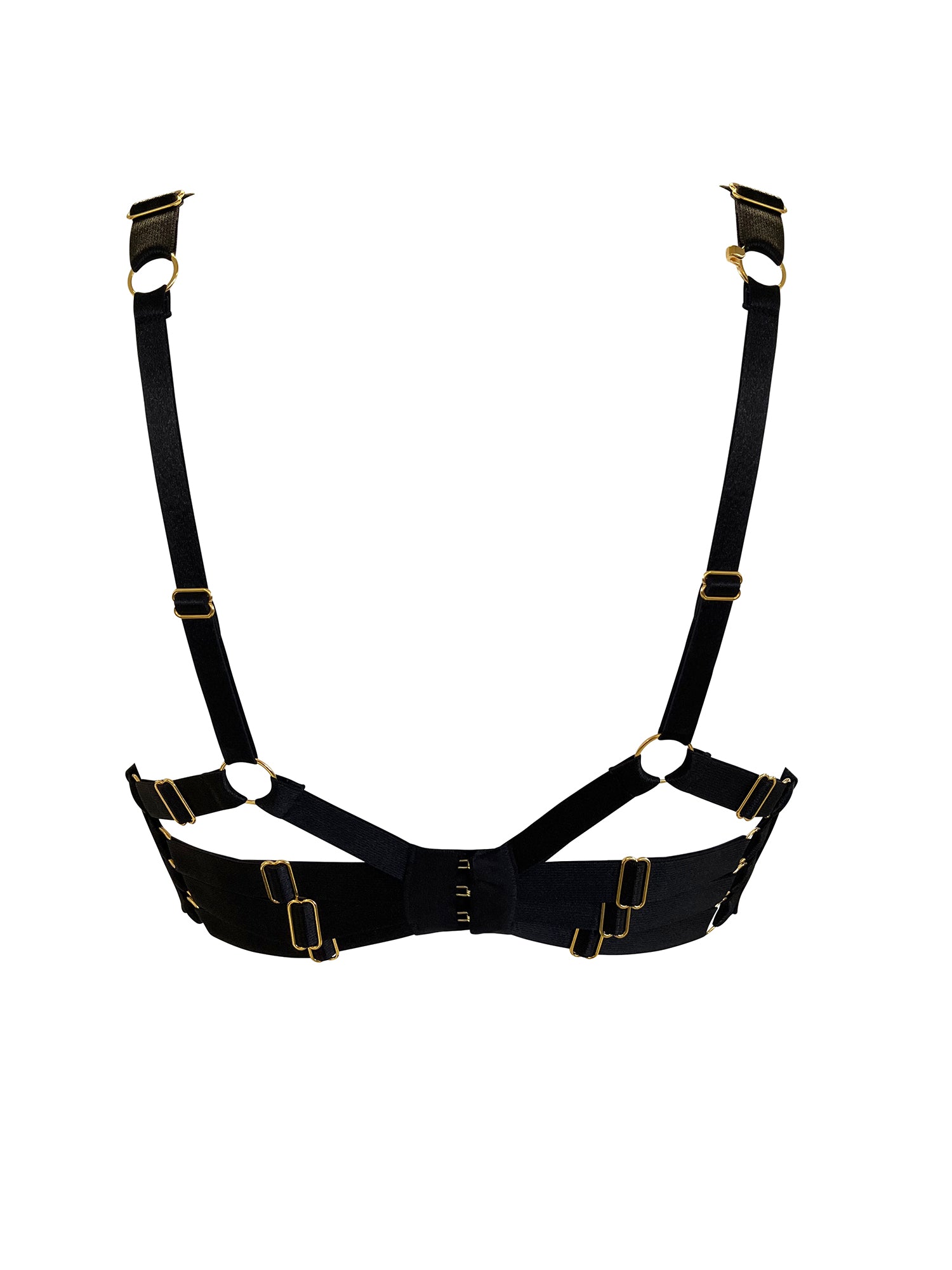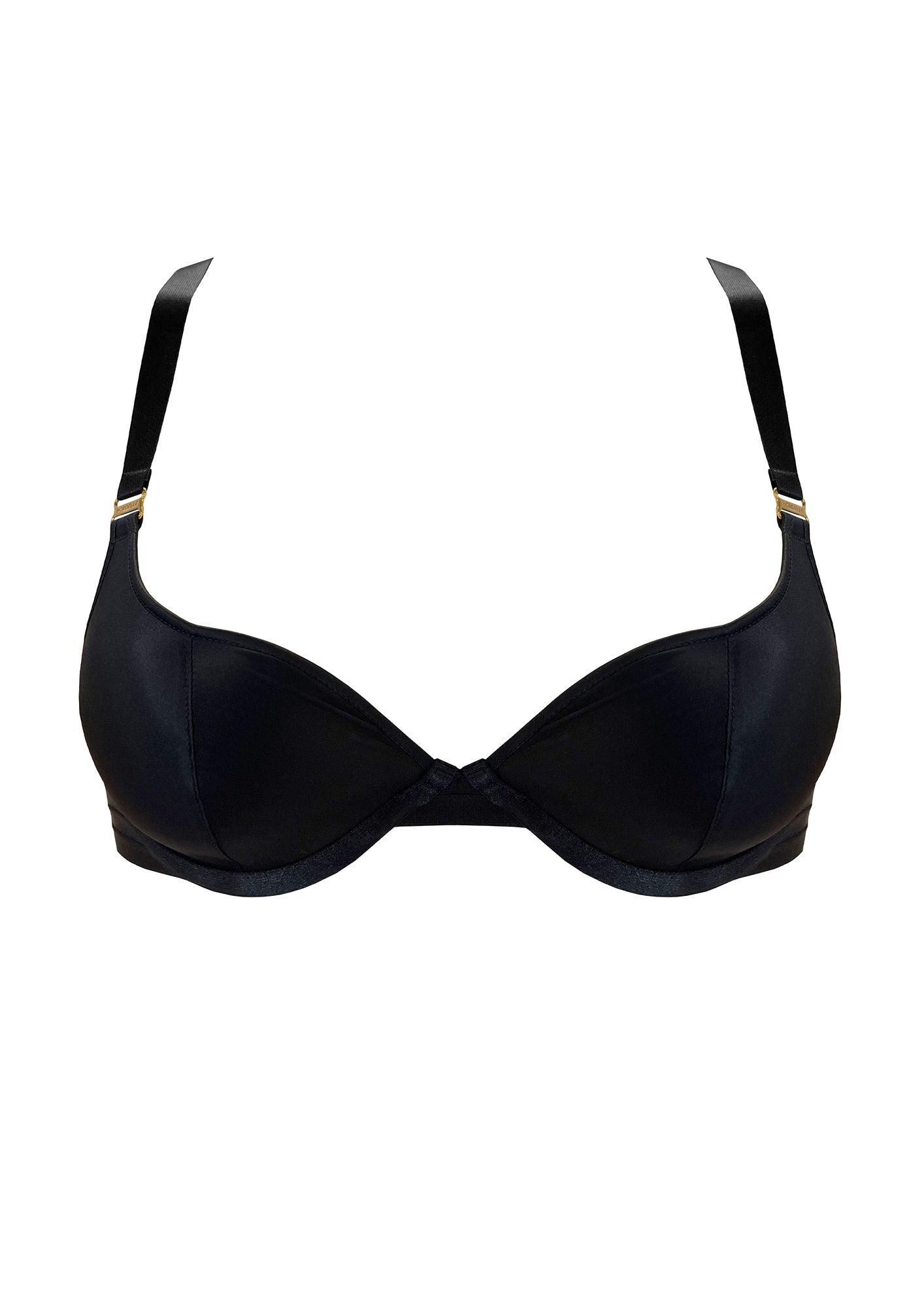 A black satin push-up bra silhouette featuring moulded cups covered in smooth silk and fully adjustable back straps. Secured with a hook & eye fastening at the center-back, with an additional hook near the top of the straps for optional extra 'push'.