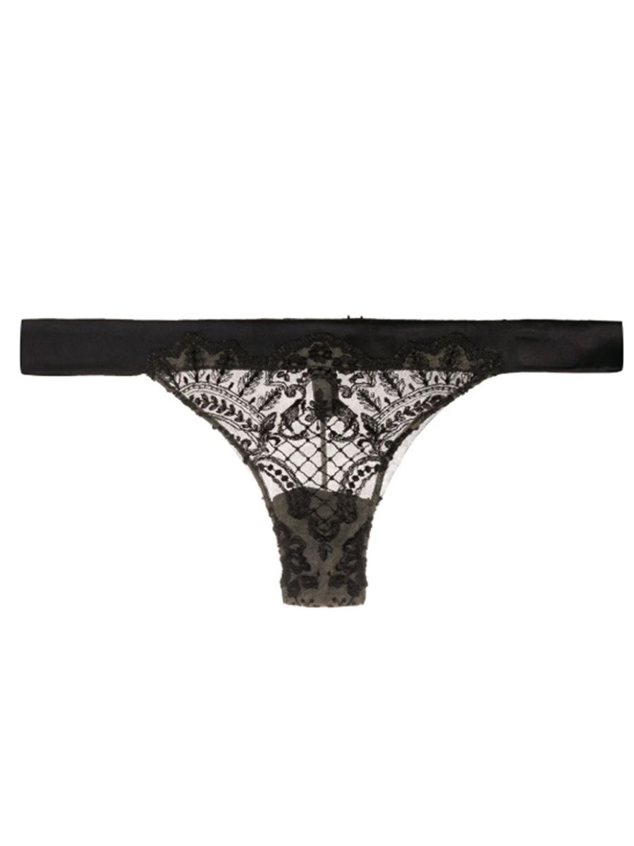 Black cotton blend embroidered thong from I.D.Sarrieri featuring a sheer construction, a low rise and a stretch fit.