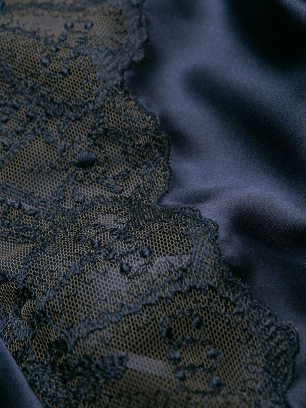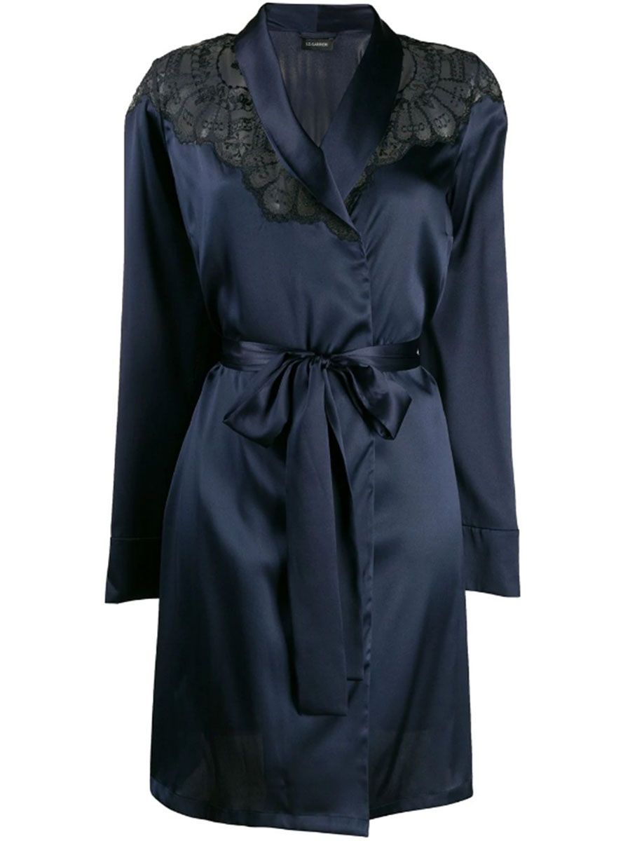 Dark blue silk and cotton blend embroidered short robe from I.D.Sarrieri featuring an open front, a lace detail, long sleeves, a belted waist and a straight hem.