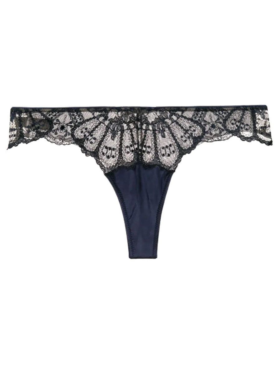 Dark blue silk blend embroidered g-string thong from I.D.Sarrieri featuring an elasticated hem, a lace pattern and a stretch fit. Underwear and lingerie must be tried on over your own garments.