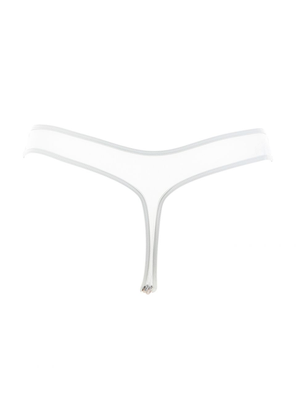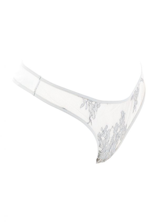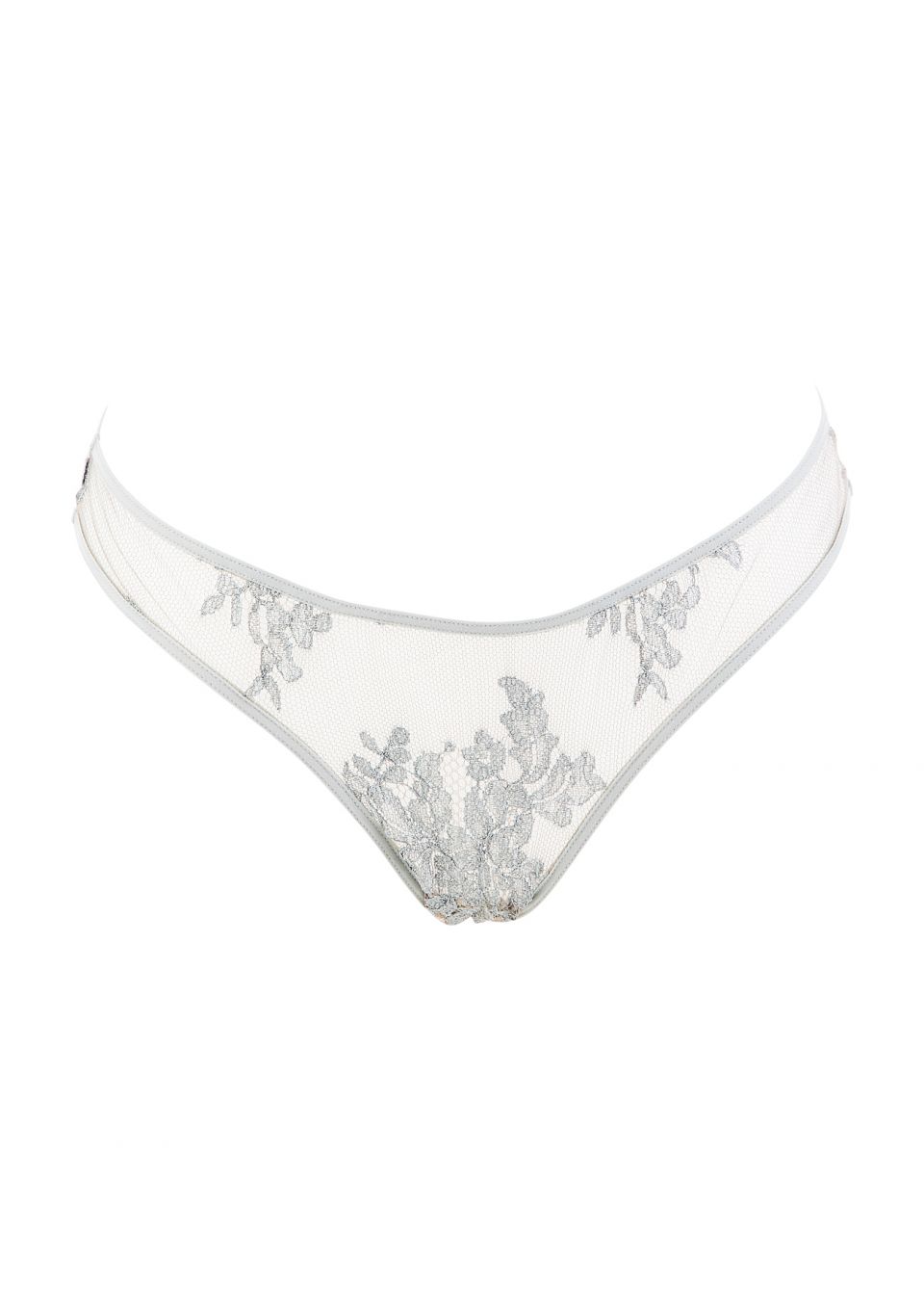 Feminine and sophisticated, this classic shape thong features Chantilly lace with a floral print that creates a metallic glow on the nude tulle. Complete this ensemble with the Blue Jasmine Underwire Bra.