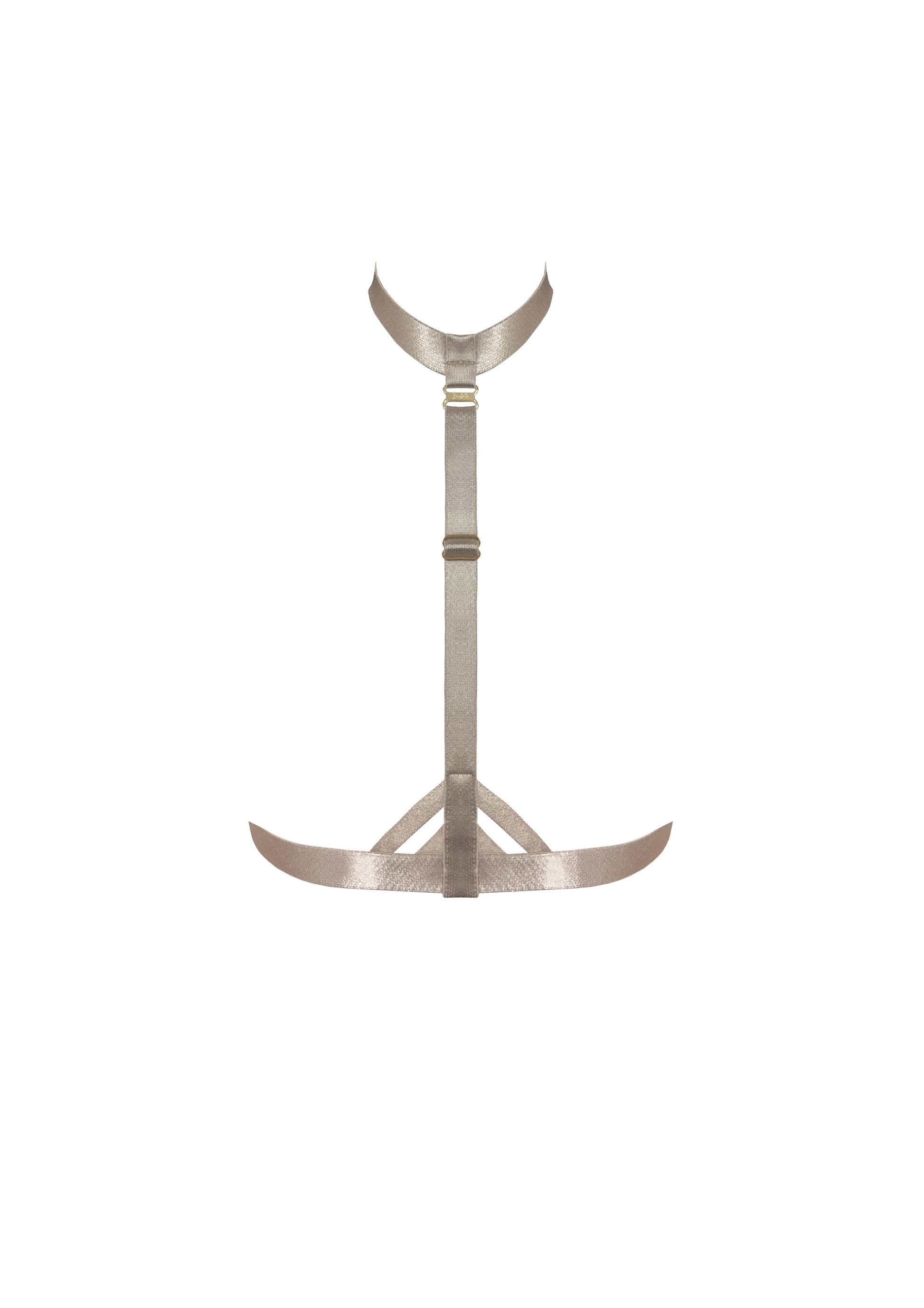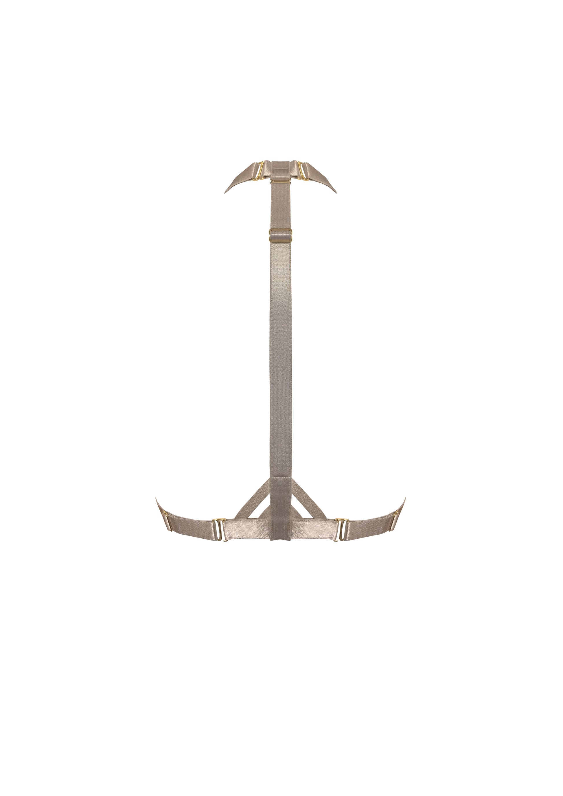 A simple yet elegant harness in luxurious caramel satin elastic strapping. Fully adjustable for a personalised fit, this versatile piece can be worn alone, layered over a bra or styled with outerwear.