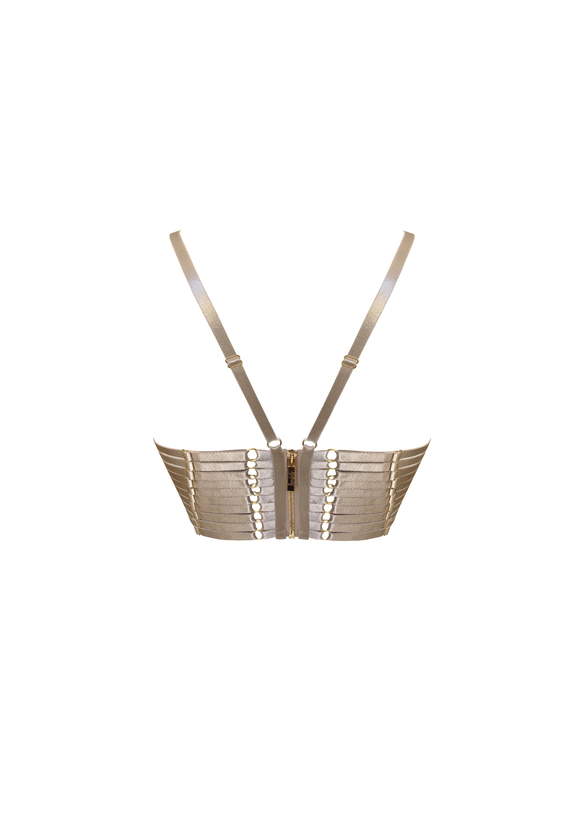 A best-selling style. This statement crop top predominantly comprises caramel satin elastic strapping, with a soft mesh underlay on the cups designed to be seen.