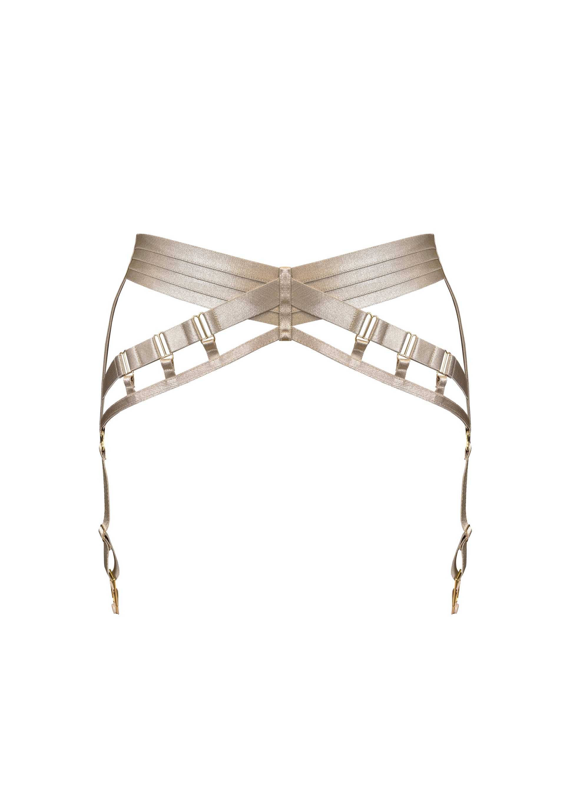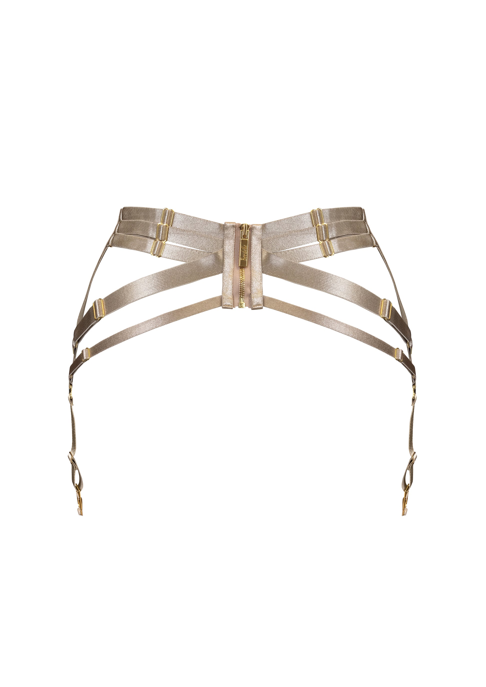 Caramel panel suspender from BORDELLE featuring stretch design, adjustable fit, satin finish and 24k gold plated zip fastening.