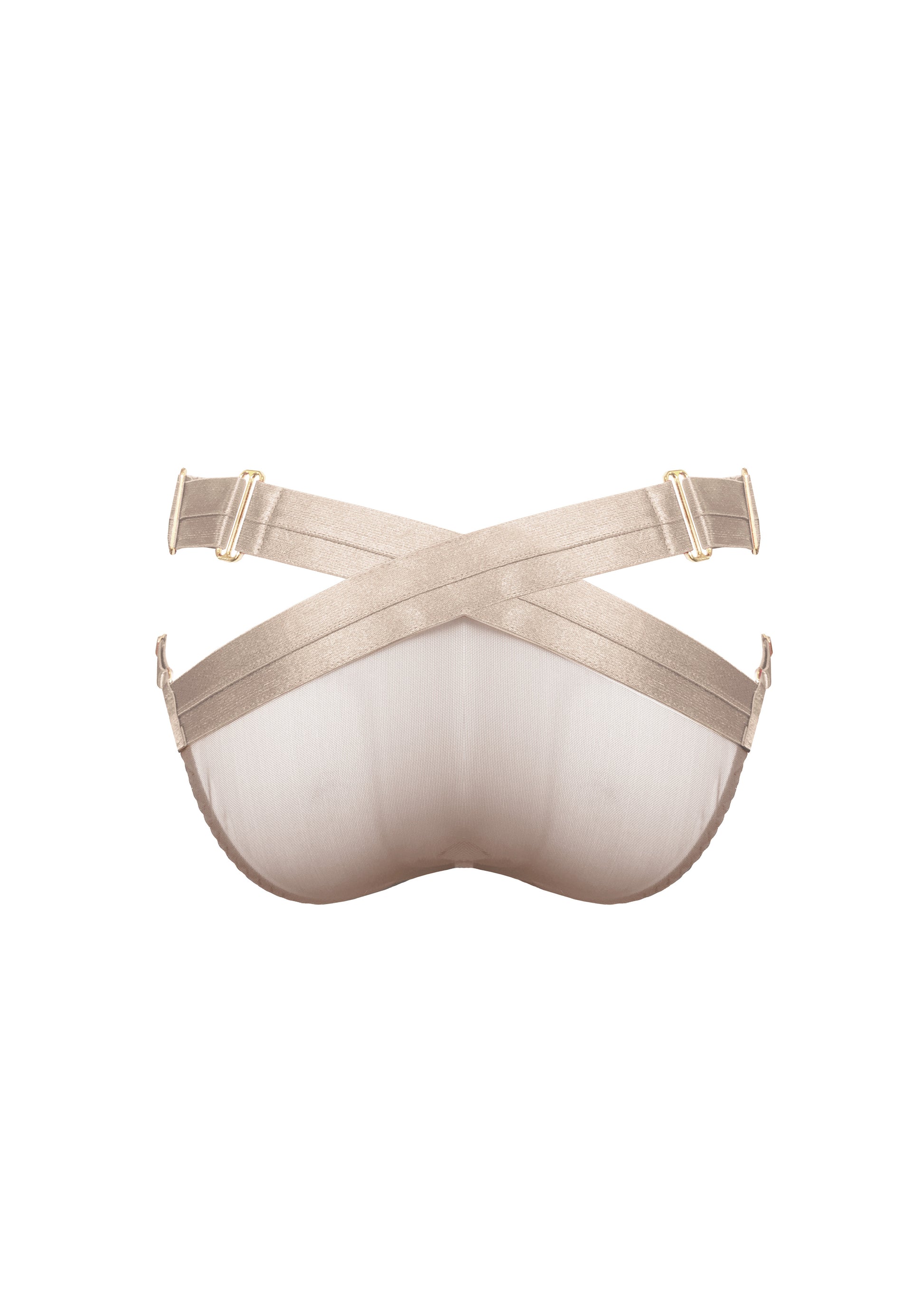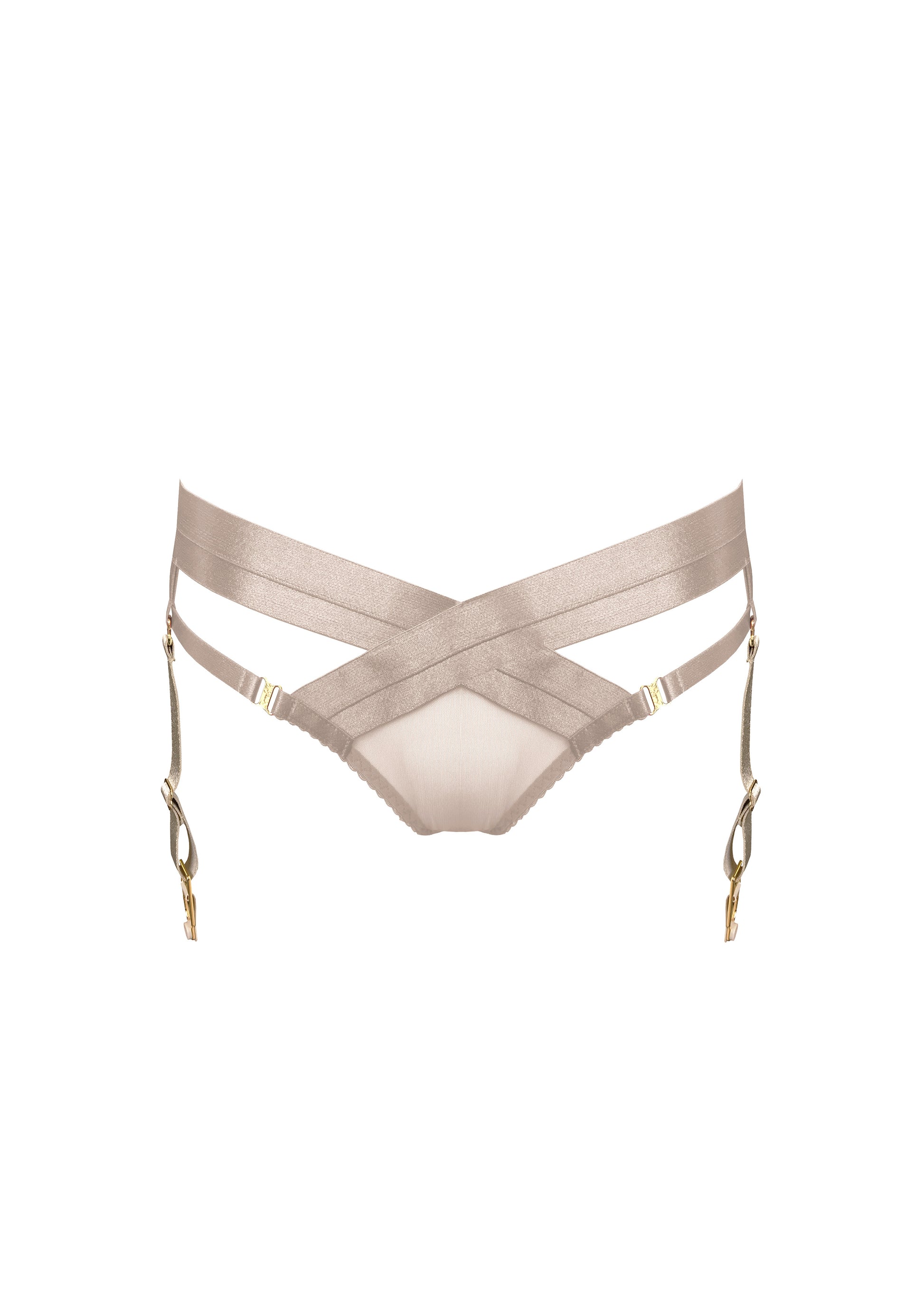 Caramel Tomoe harness briefs from BORDELLE featuring stretch design, sheer panelling and adjustable side straps.
