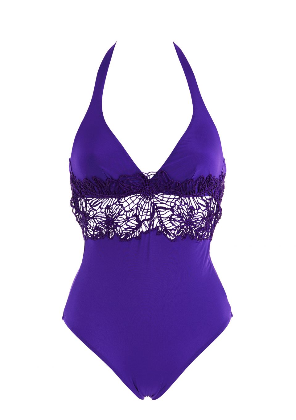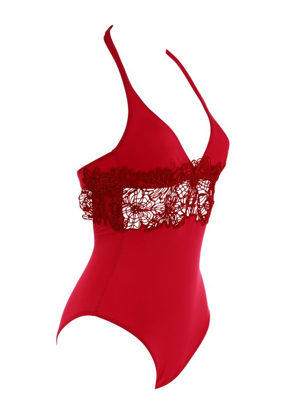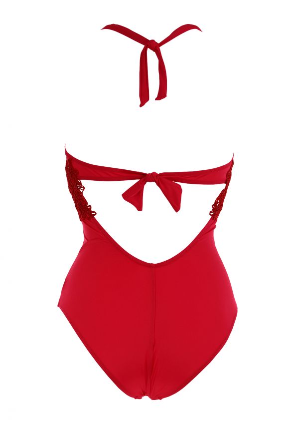 A stunning and vibrant coral red swimsuit with a gorgeous crochet lace panel just under the bust. The pretty floral design crochet gives a fun and flirty touch without showing off too much...