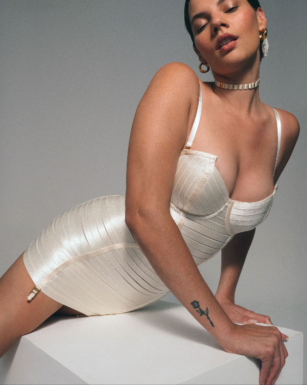 Cream corset slip from Bordelle featuring adjustable straps, underwired cups, a fitted silhouette, a strappy design and a back zip fastening.