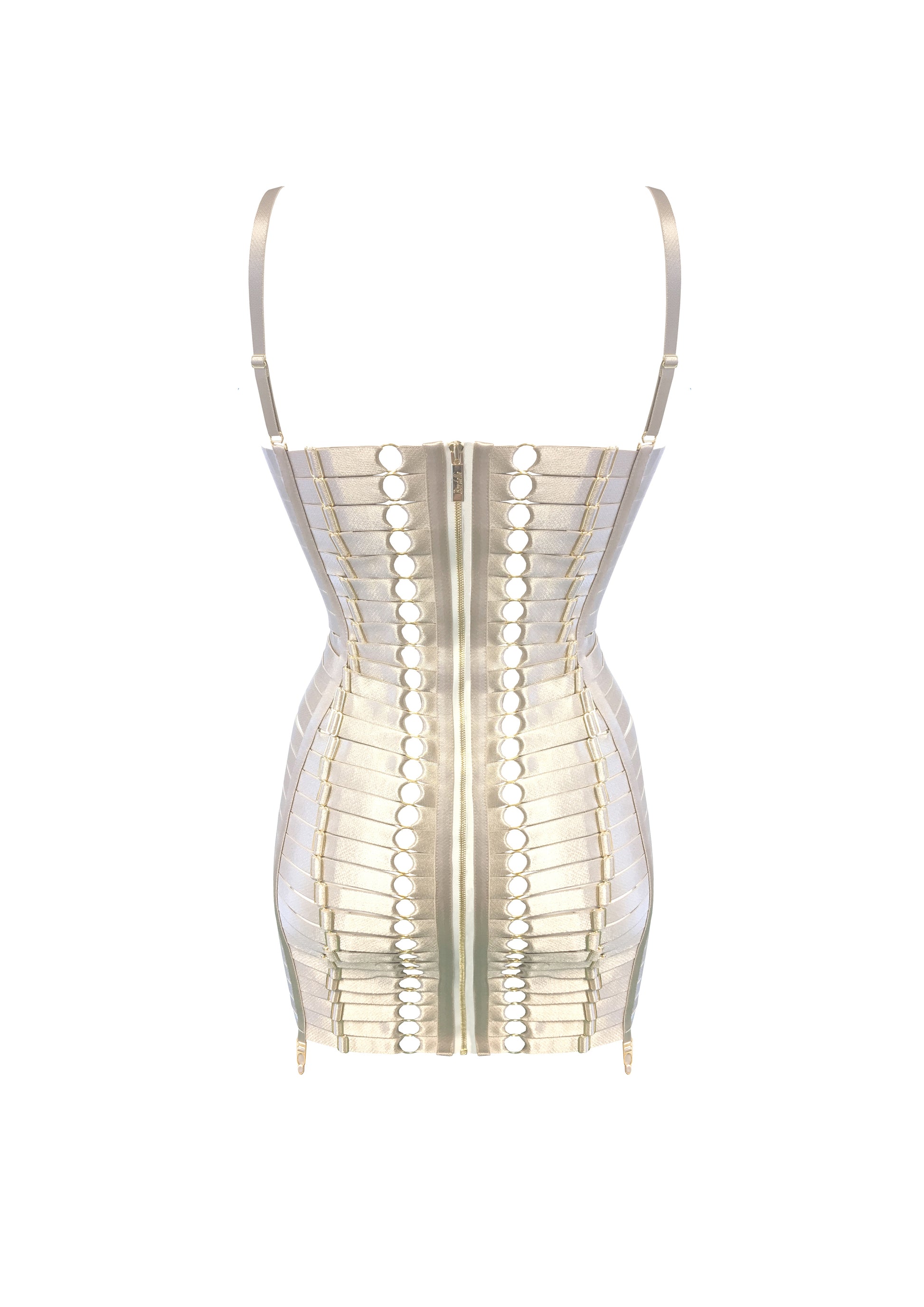 Introducing the Adjustable Luxe Bondage Angela, the epitome of Bordelle's exquisite bondage craftsmanship, meticulously designed to enhance every curve. This remarkable ensemble is meticulously crafted with more than 150 components, each plated with 24k gold. The creation process for each dress spans an entire day, ensuring unparalleled attention to detail and quality.