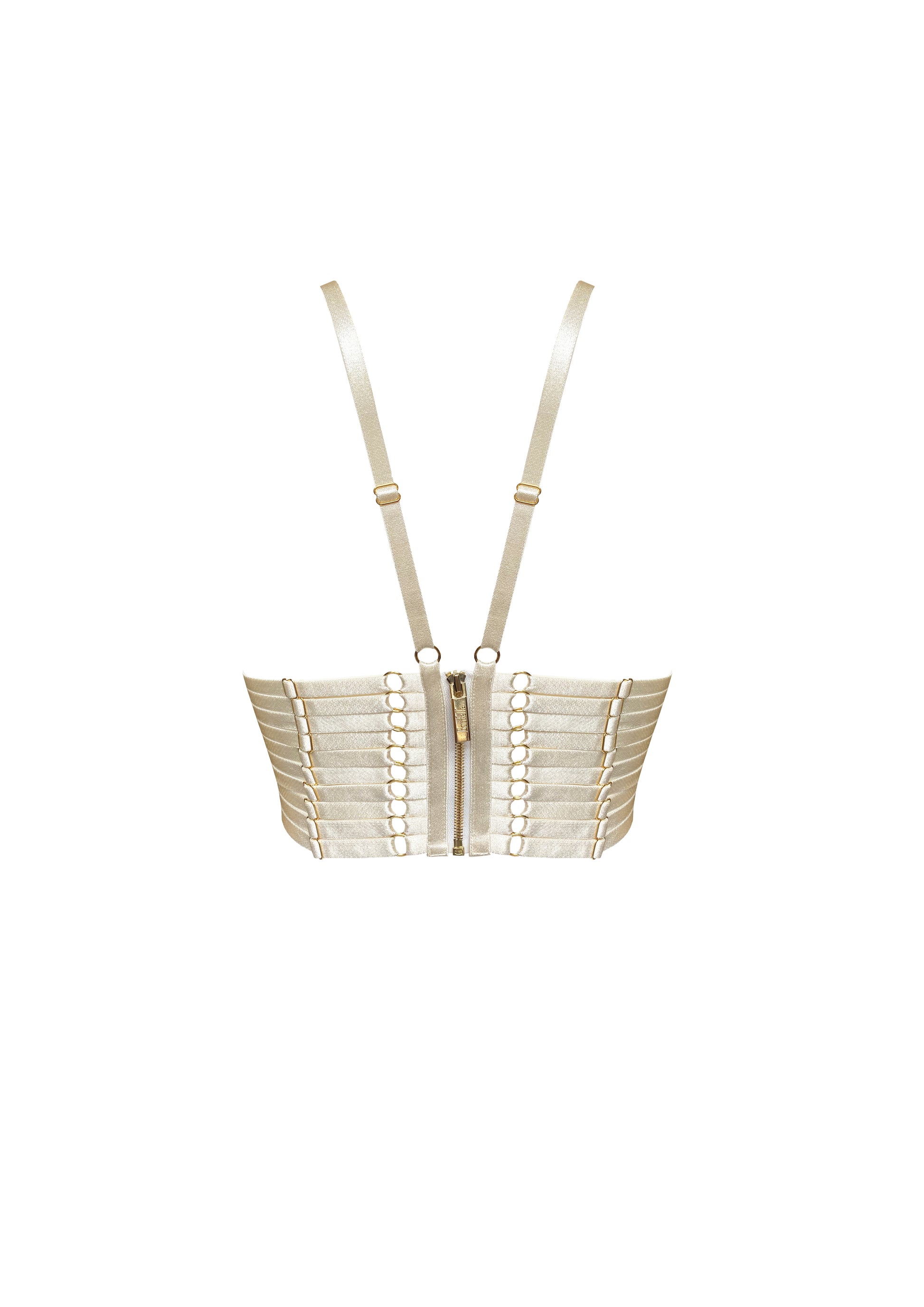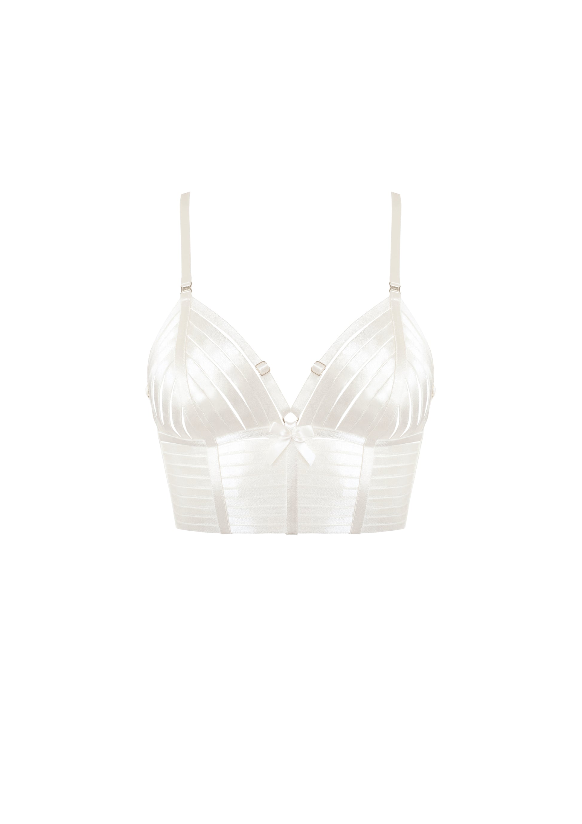 A best-selling style. This statement crop top predominantly comprises cream satin elastic strapping, with a soft mesh underlay on the cups designed to be seen. A non-wired longline bra with triangle cups that have a soft mesh lining for coverage and gentle support. Crafted almost entirely from signature satin elastic strapping, this style is designed to be seen and perfect for styling as outerwear.