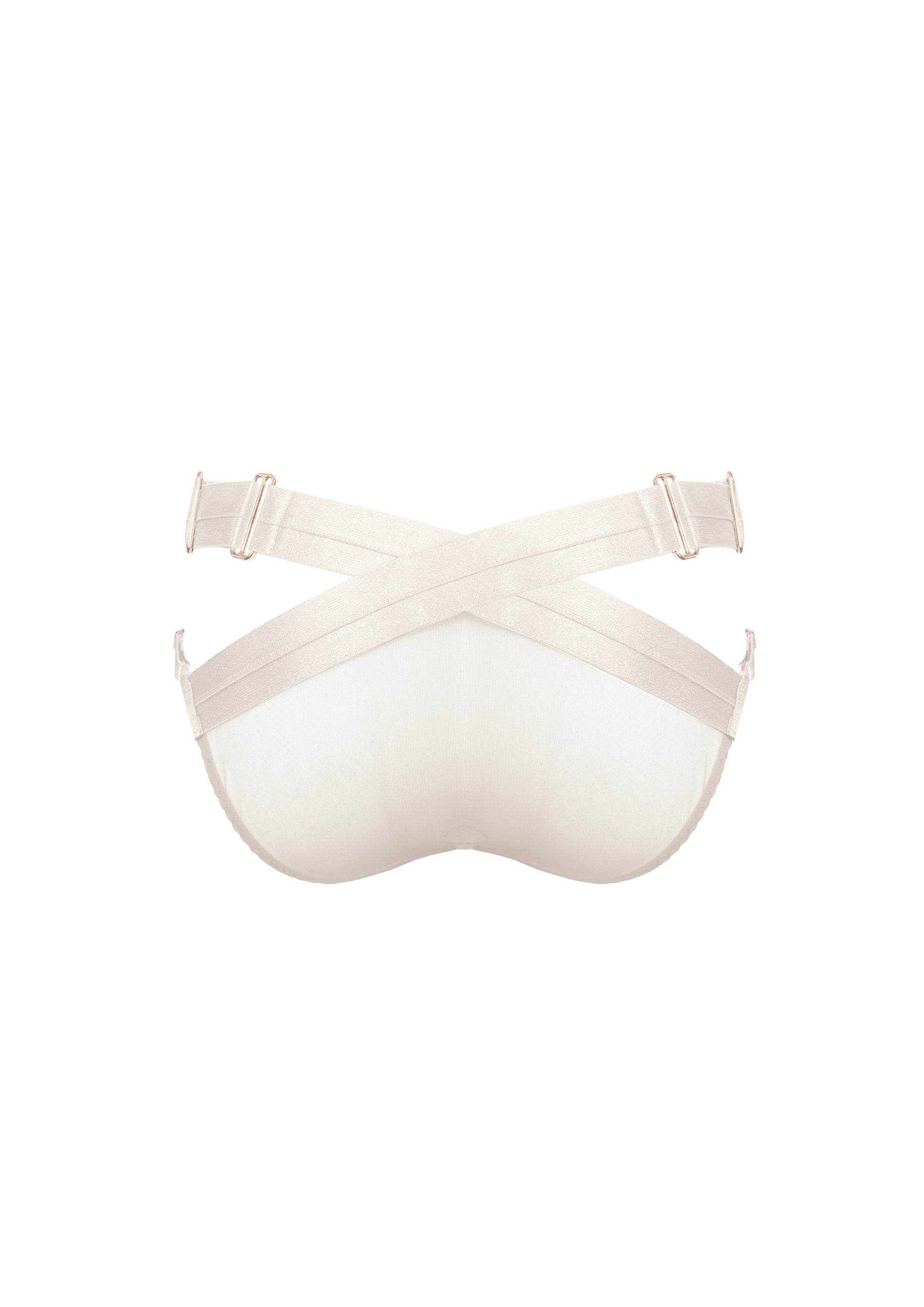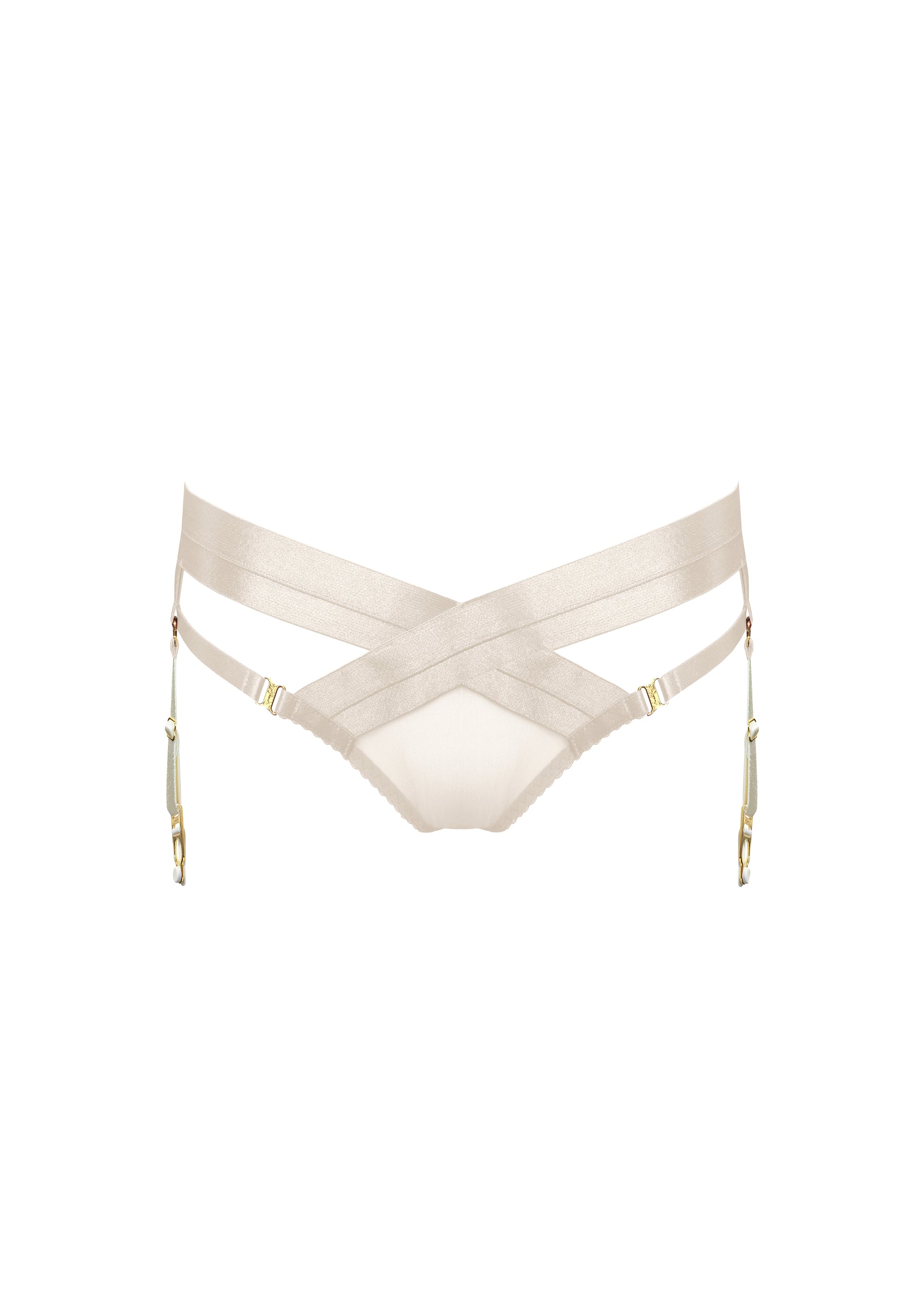 Cream Tomoe harness briefs from BORDELLE featuring stretch design, sheer panelling and adjustable side straps.
