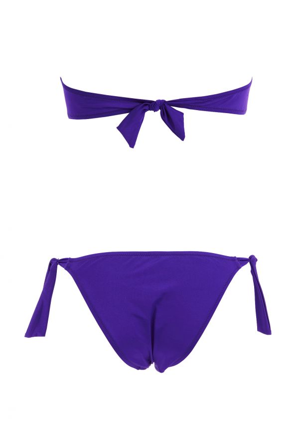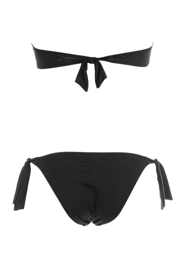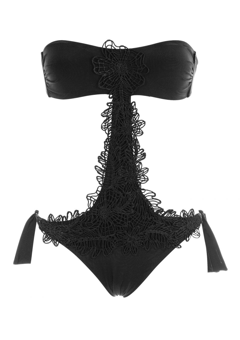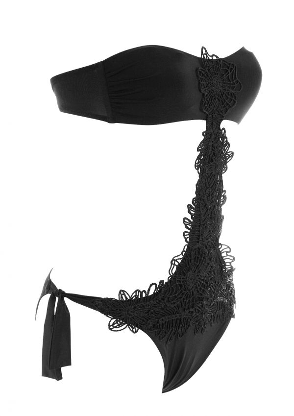 A sensational and sizzling swimsuit in demure black. This daring cut-out swimsuit has a flattering bandeau cut joining the brazilian cut bottoms with gorgeous crochet lace. Certain to make an impact at the beach or by the pool!