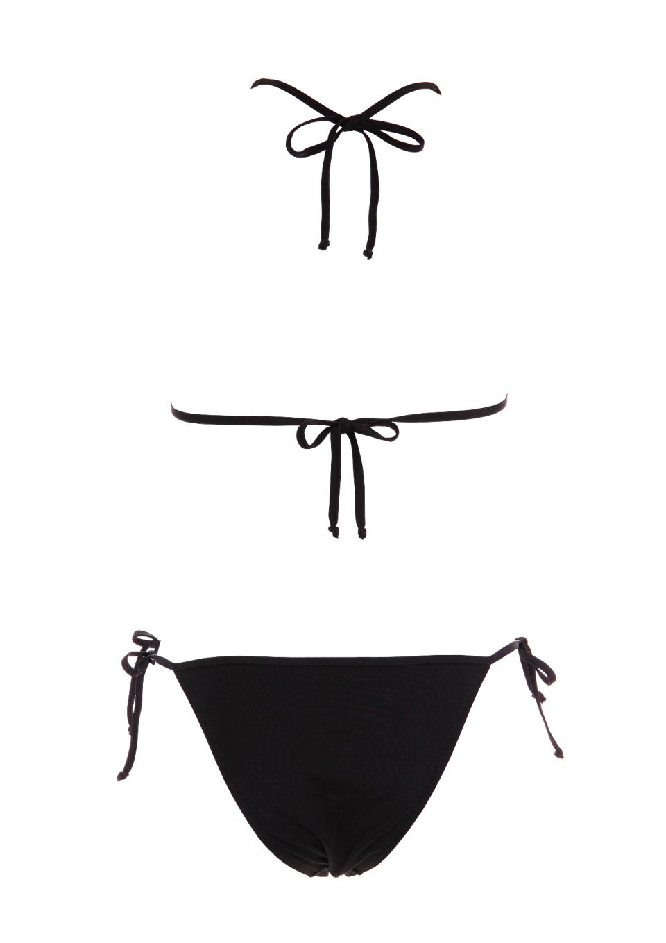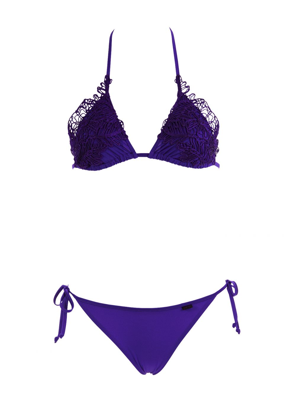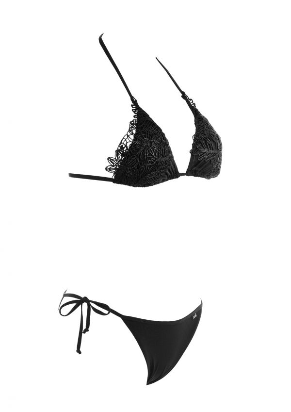 A classic cut triangle bikini with a flattering plunge halter neckline and skinny tie side bottoms. The triangle cups have beautiful floral crochet lace overlay.